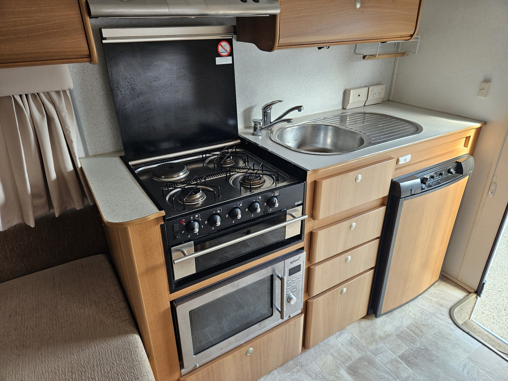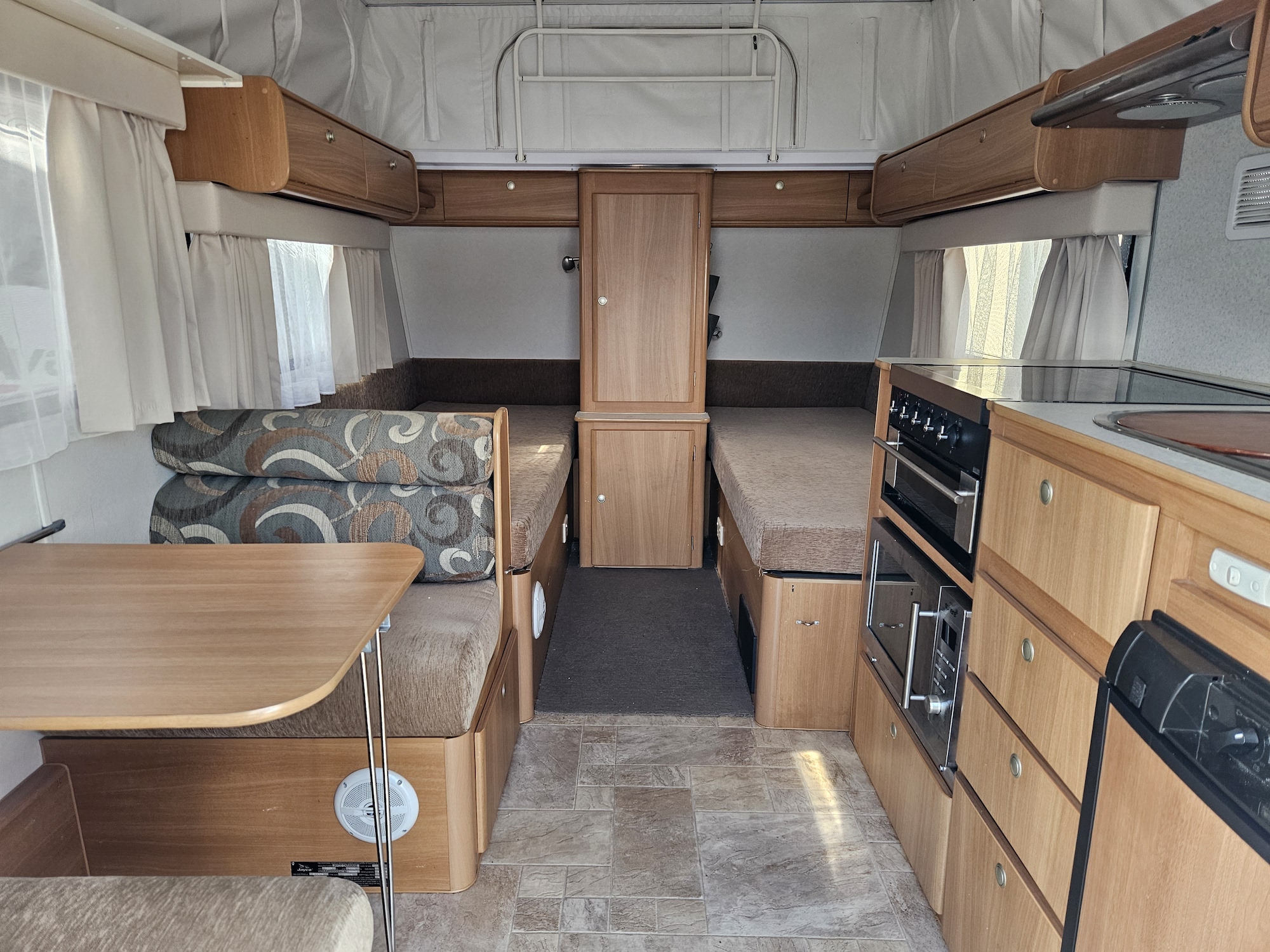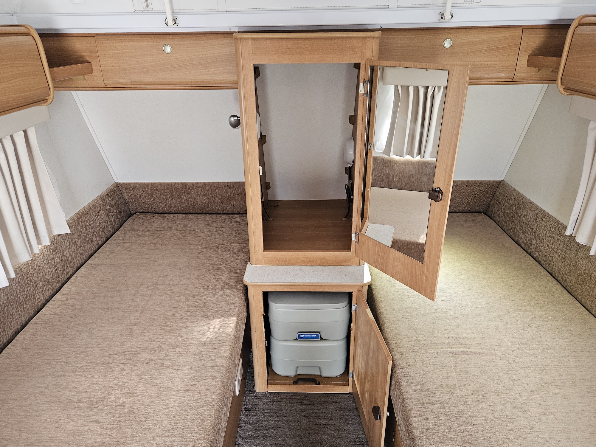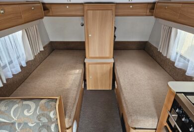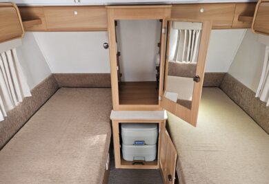 Inside you’ll find twin single beds with handy under-bed storage, café seating, and a functional kitchen with a 90L 3-way fridge, microwave, sink, cooktop and griller. Extras like a stereo, reading lights, wardrobe, and porta potty add to the practicality.