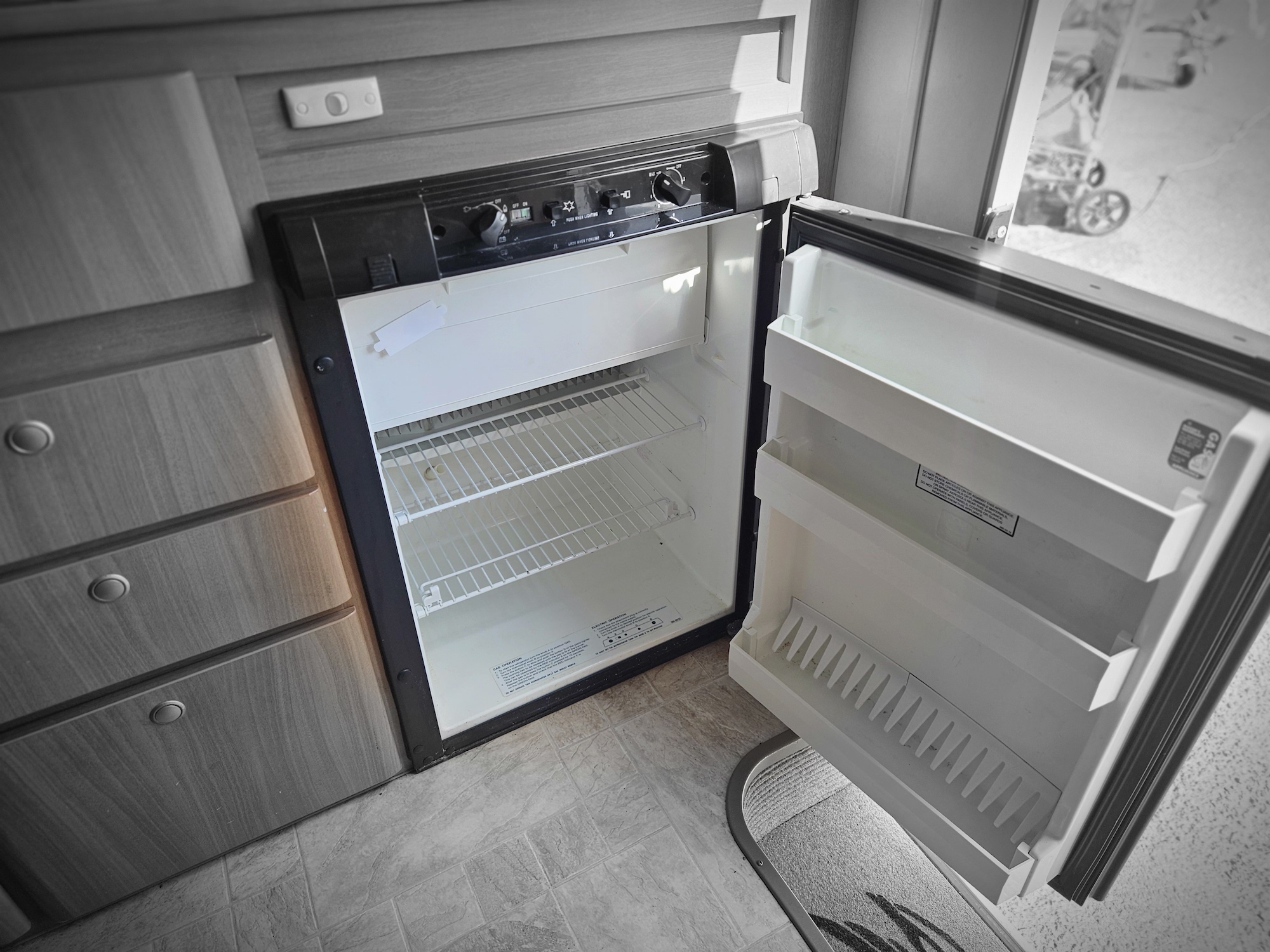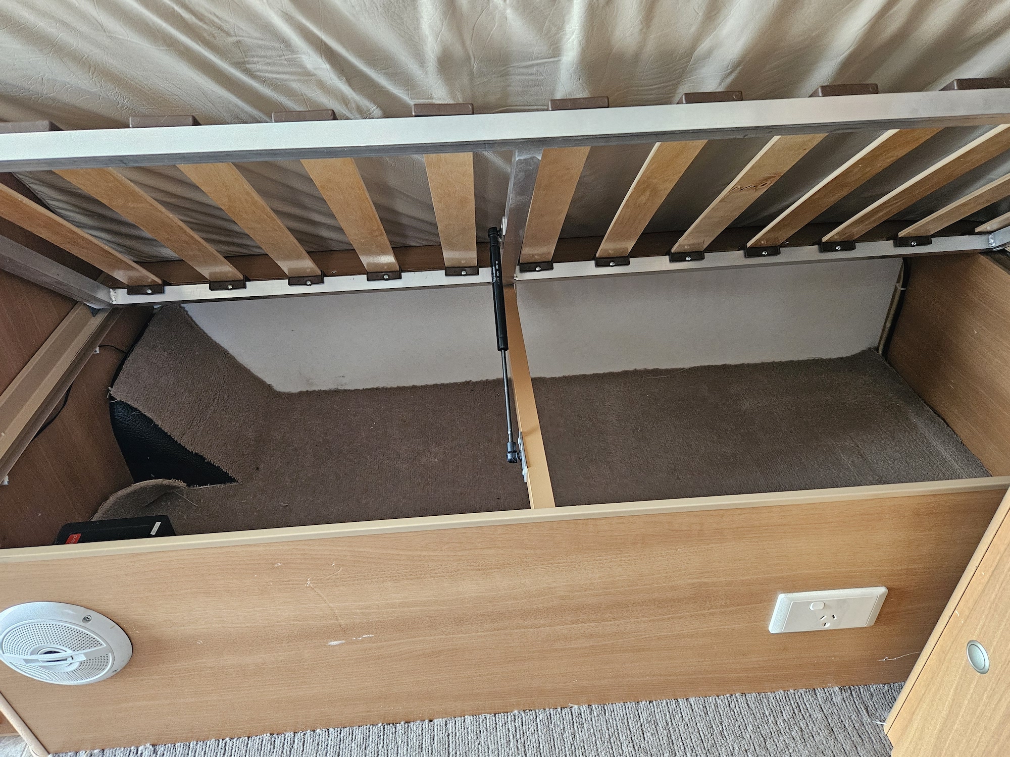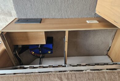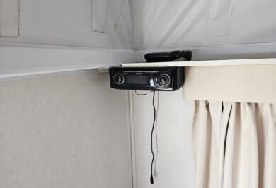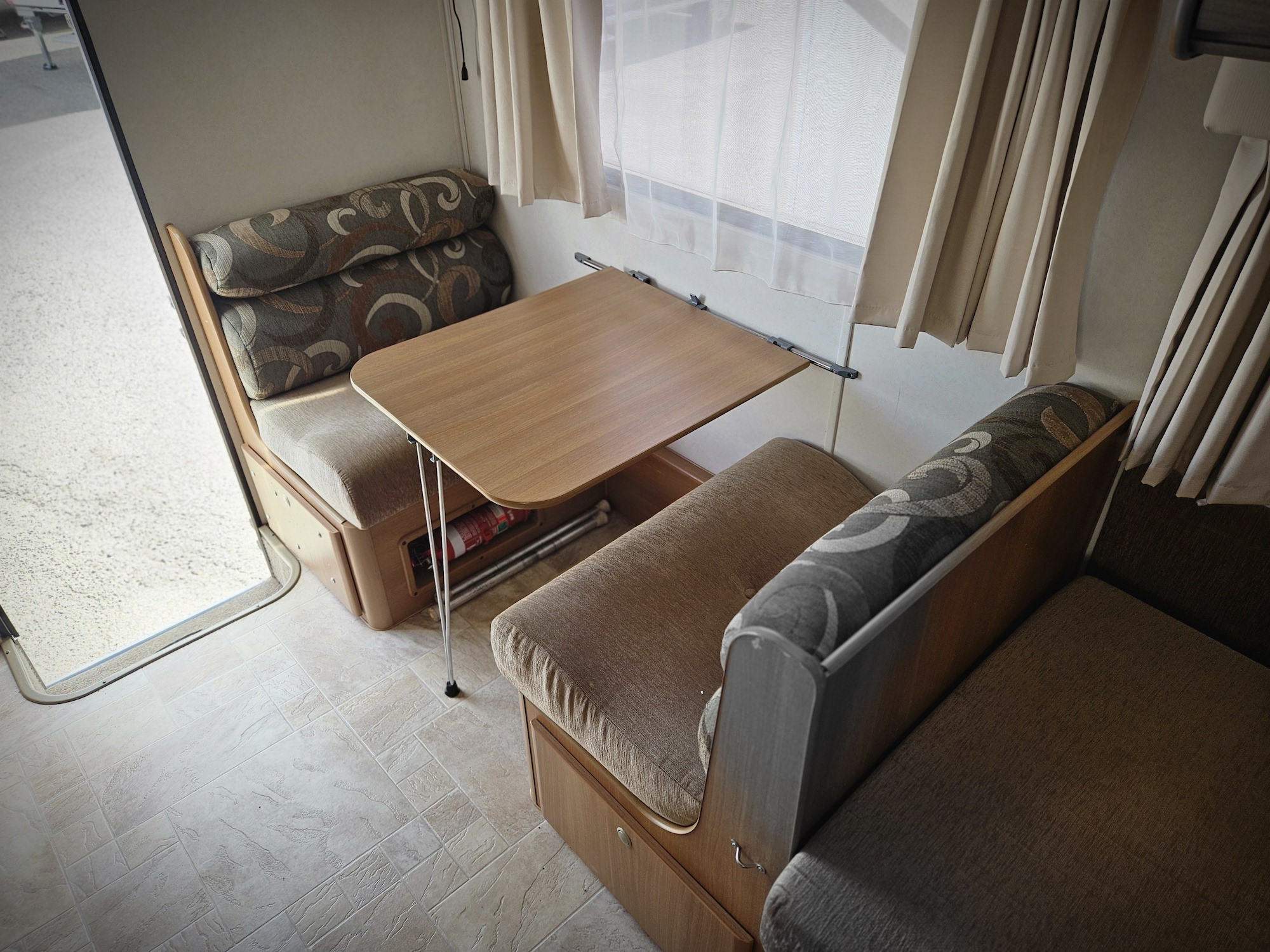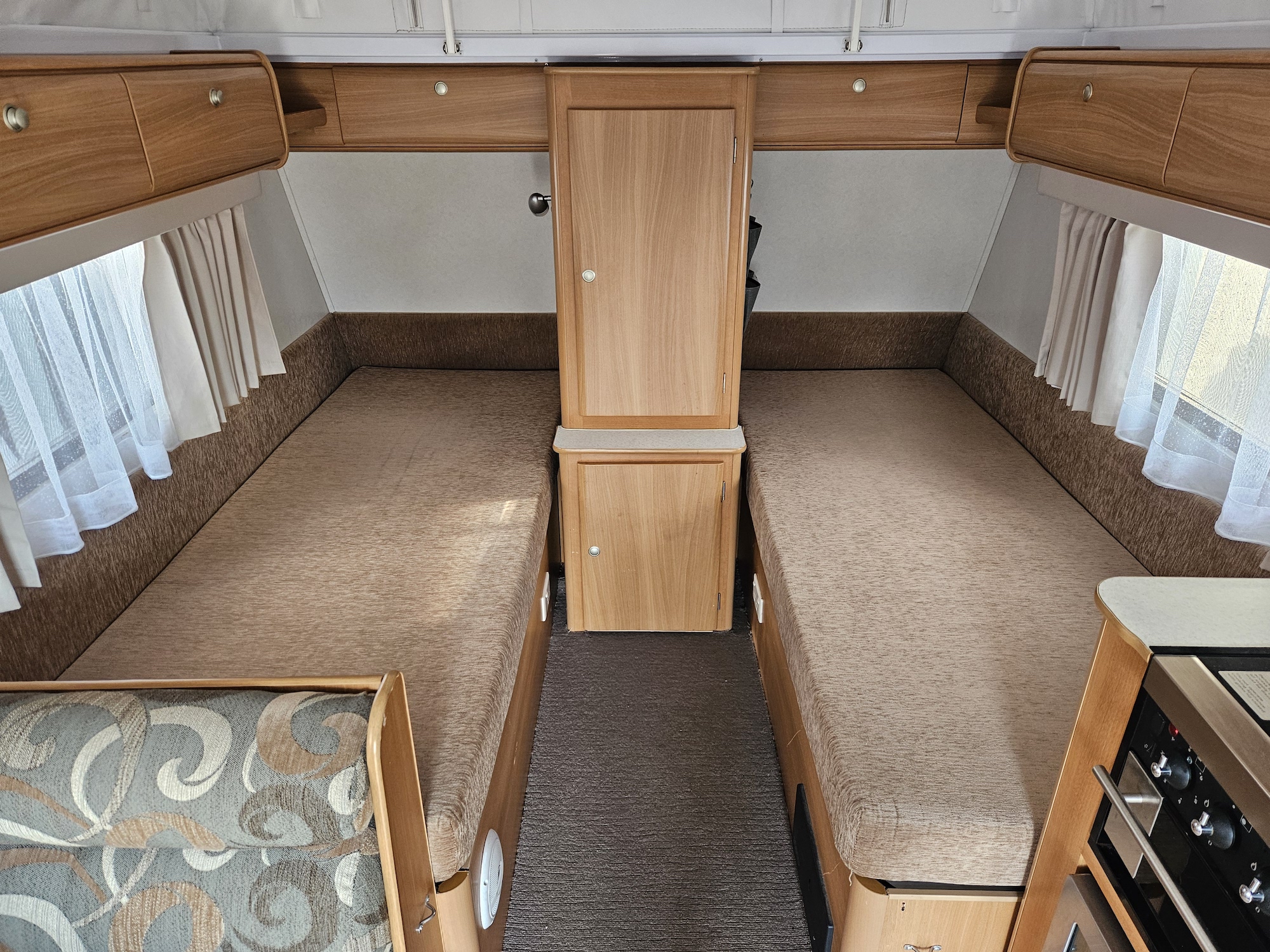 Inside you’ll find twin single beds with handy under-bed storage, café seating, and a functional kitchen with a 90L 3-way fridge, microwave, sink, cooktop and griller. Extras like a stereo, reading lights, wardrobe, and porta potty add to the practicality.
