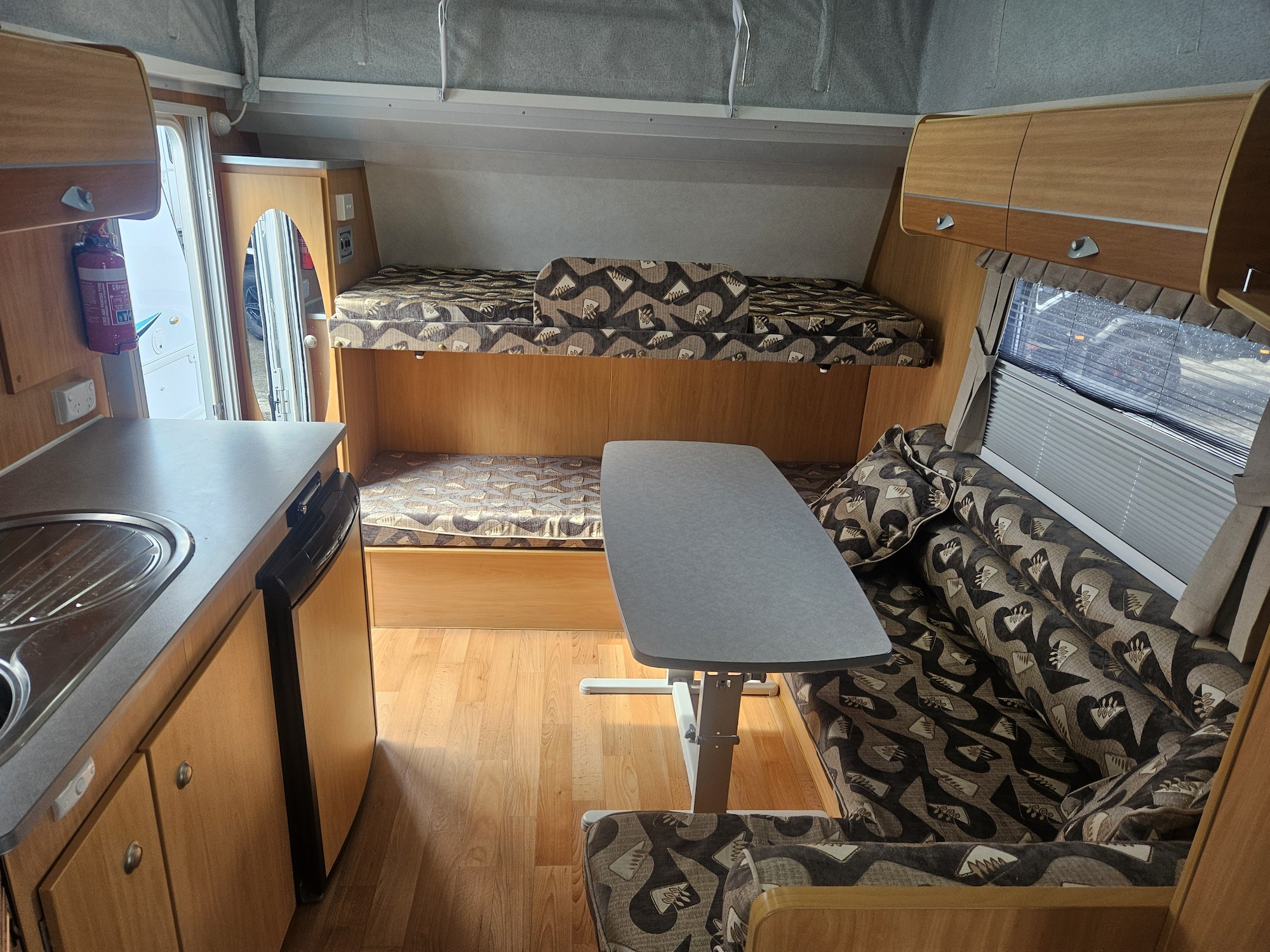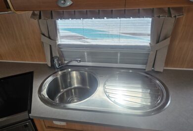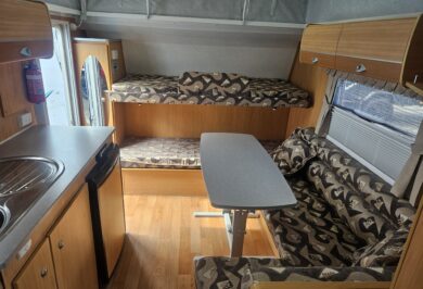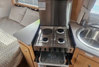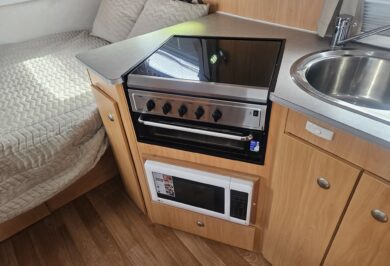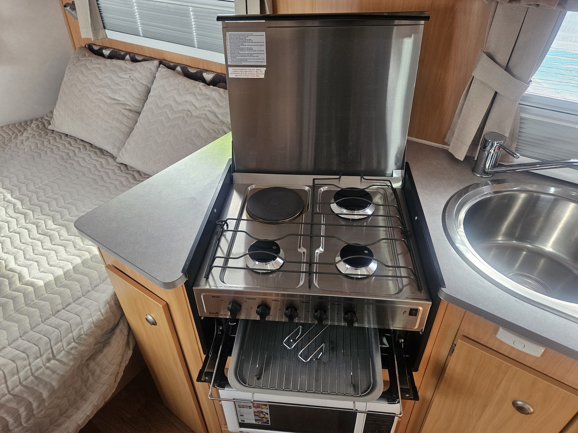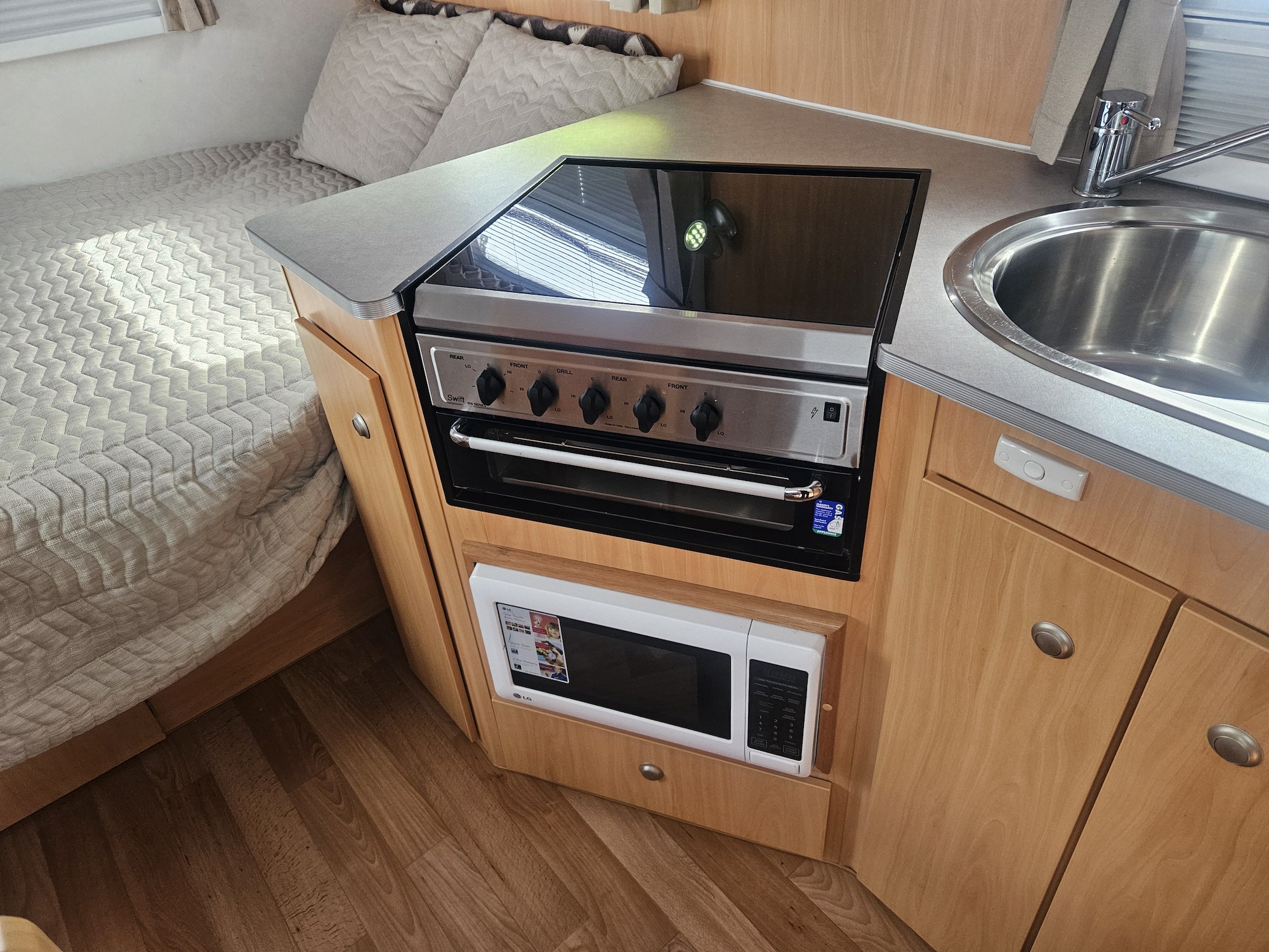 Inside, you’ll find a well-equipped kitchen with cooktop, griller, microwave, fridge, and sink, along with air conditioning to keep you comfortable year-round. Clever storage solutions, including under-bed storage and a wardrobe, make packing for trips simple and stress-free.