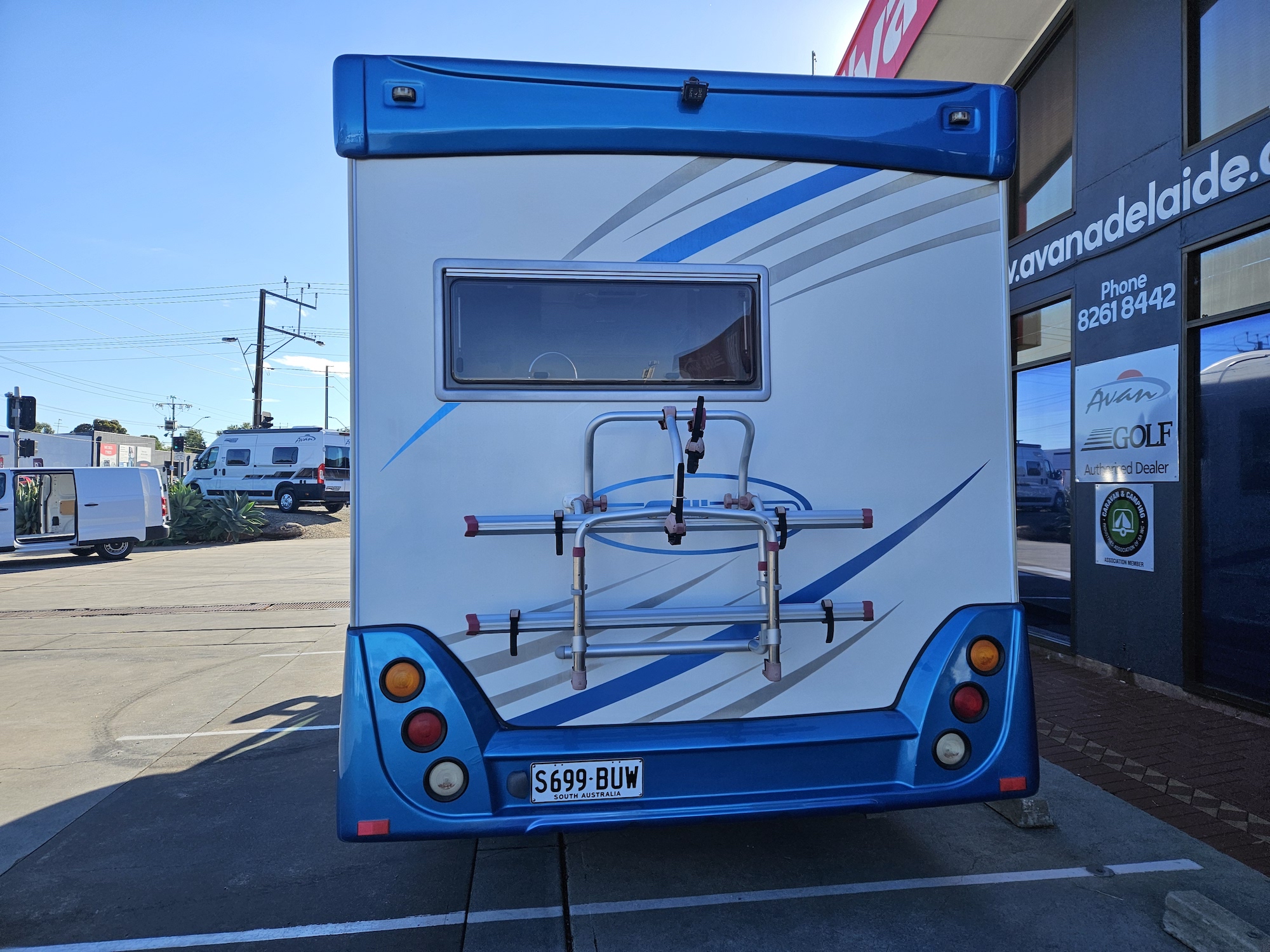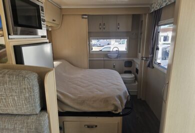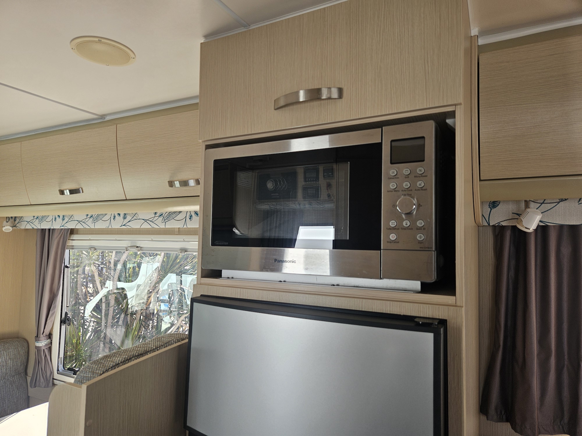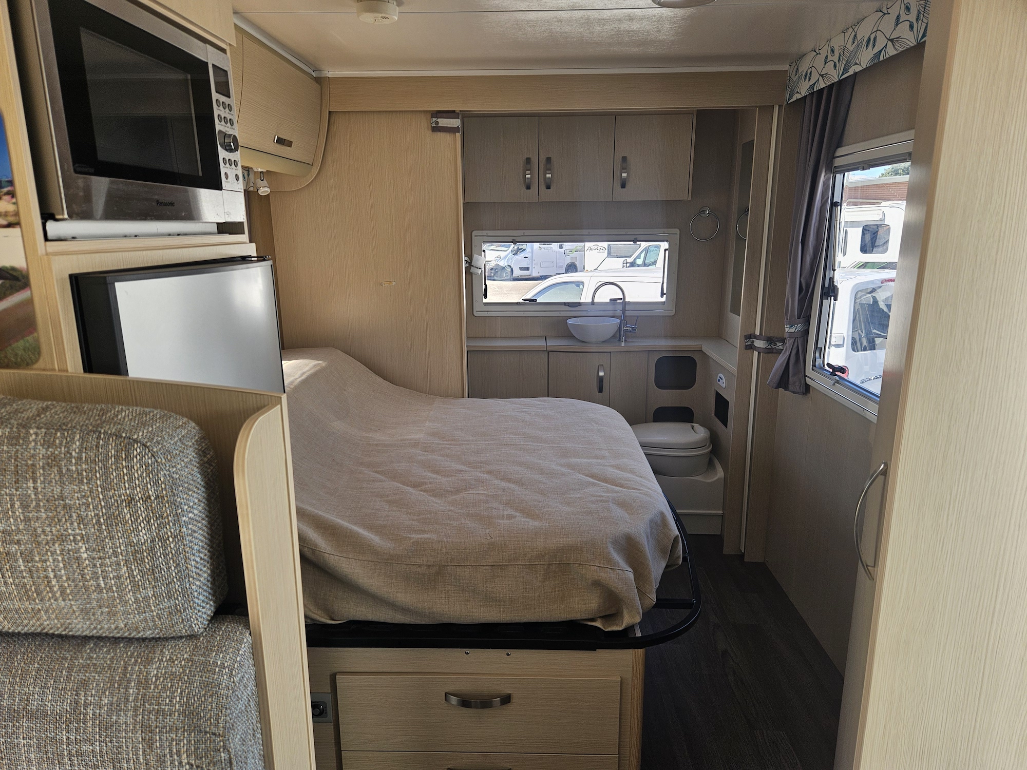 The kitchen is well equipped with a 3 gas cooktop, convection microwave oven, range hood and a Dometic 3 way fridge with freezer. There’s also reverse cycle air conditioning, TV with DVD player, Jensen sound system, reading lights, wardrobe and plenty of storage throughout.