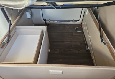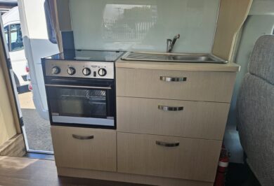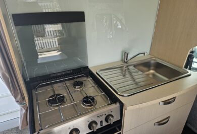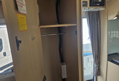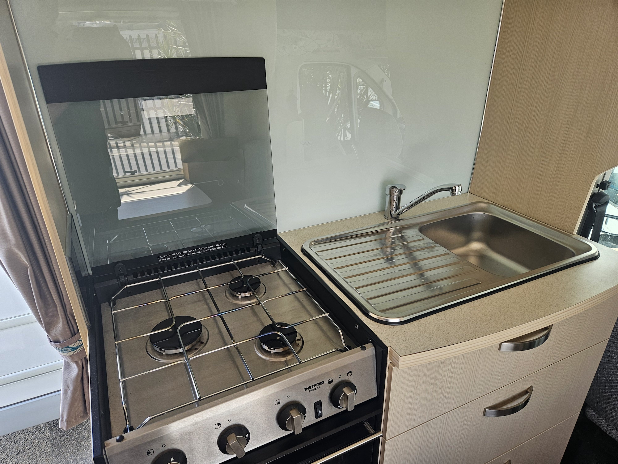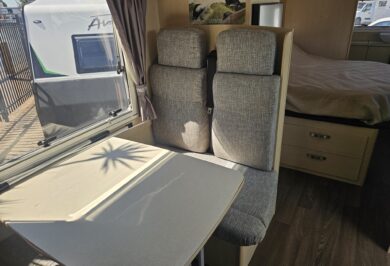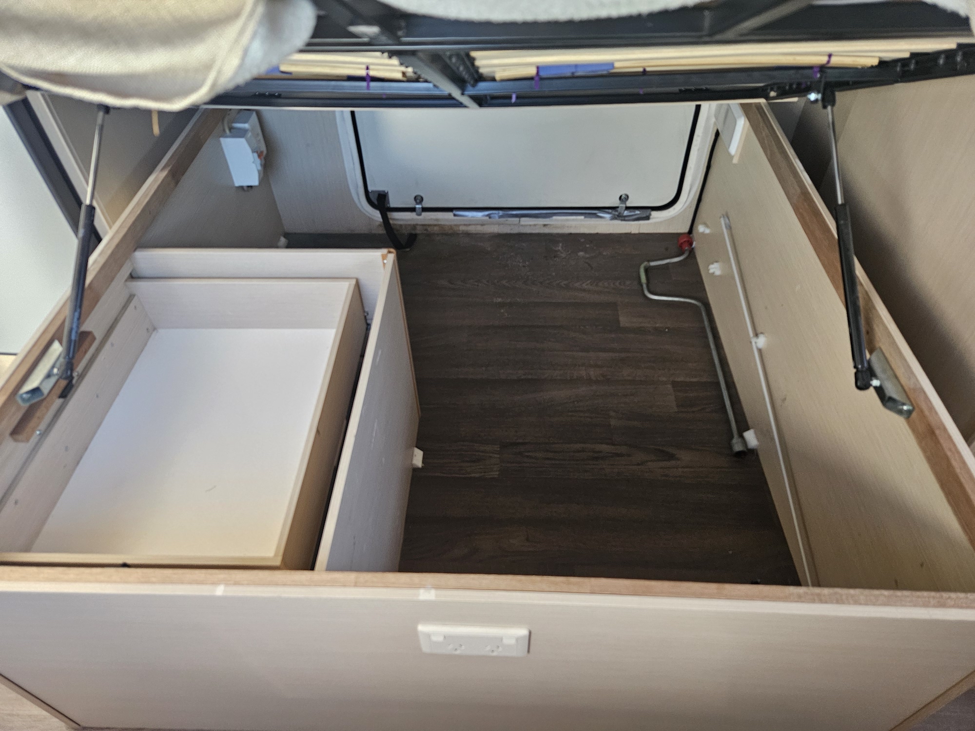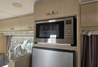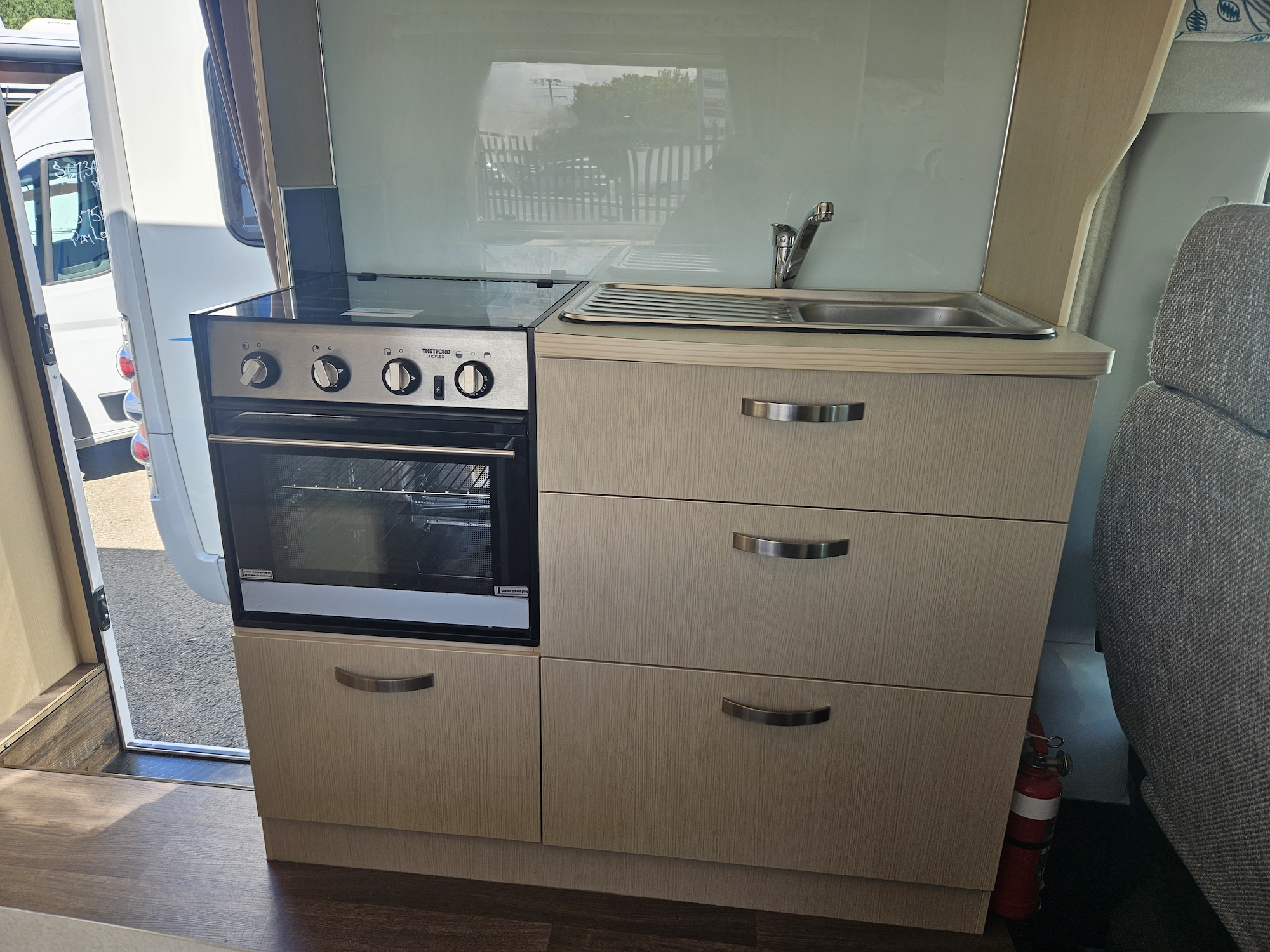 The kitchen is well equipped with a 3 gas cooktop, convection microwave oven, range hood and a Dometic 3 way fridge with freezer. There’s also reverse cycle air conditioning, TV with DVD player, Jensen sound system, reading lights, wardrobe and plenty of storage throughout.