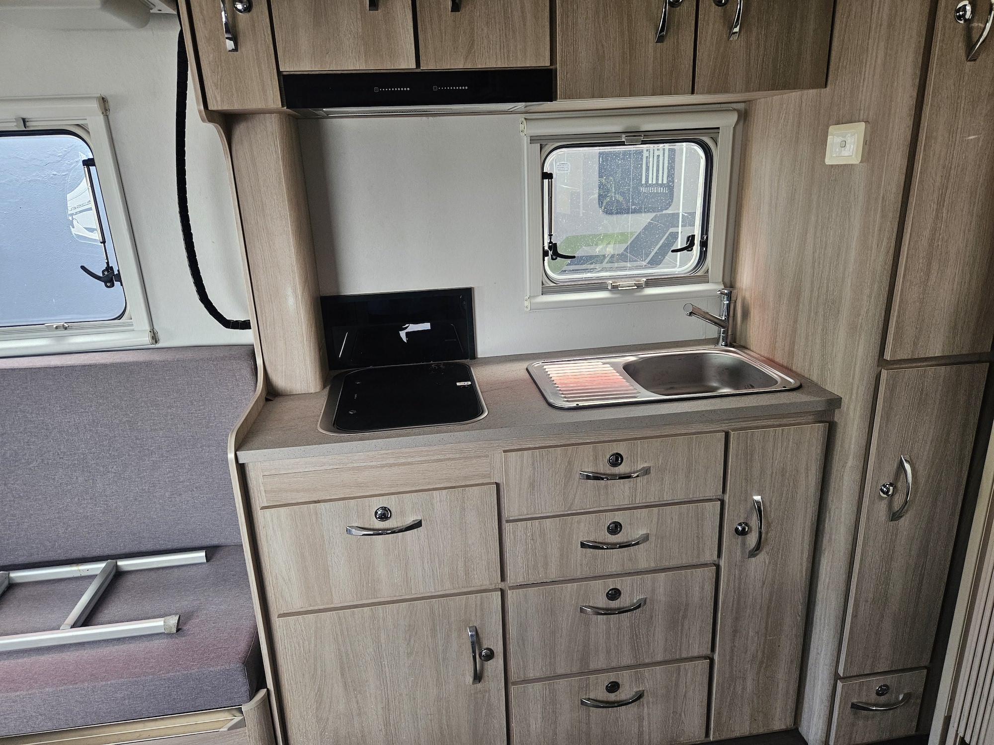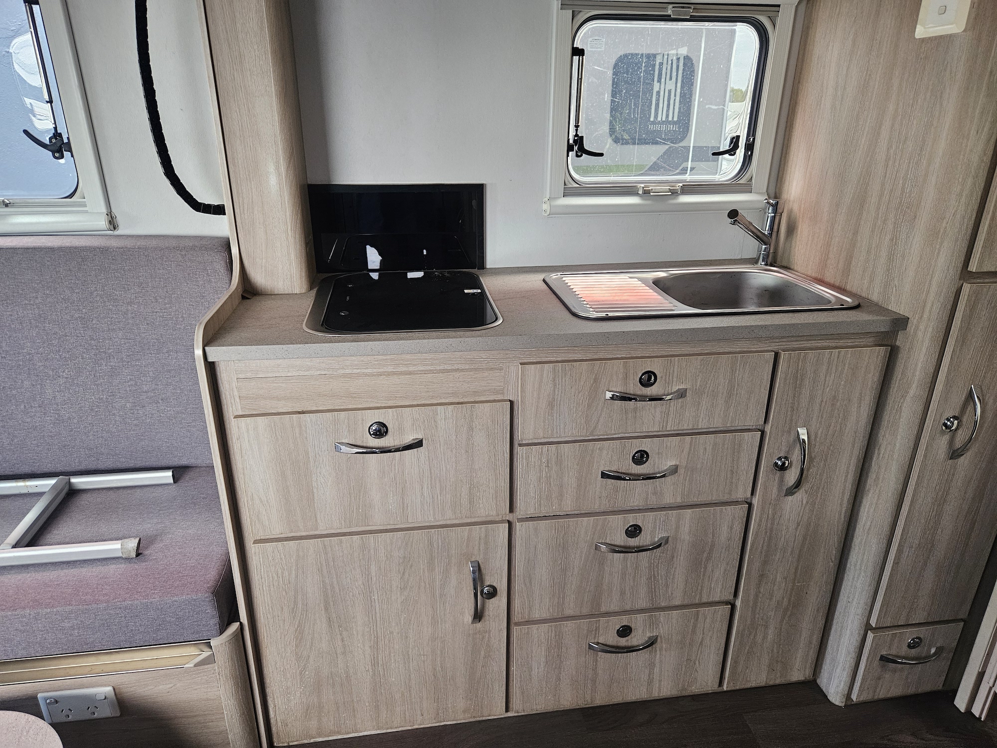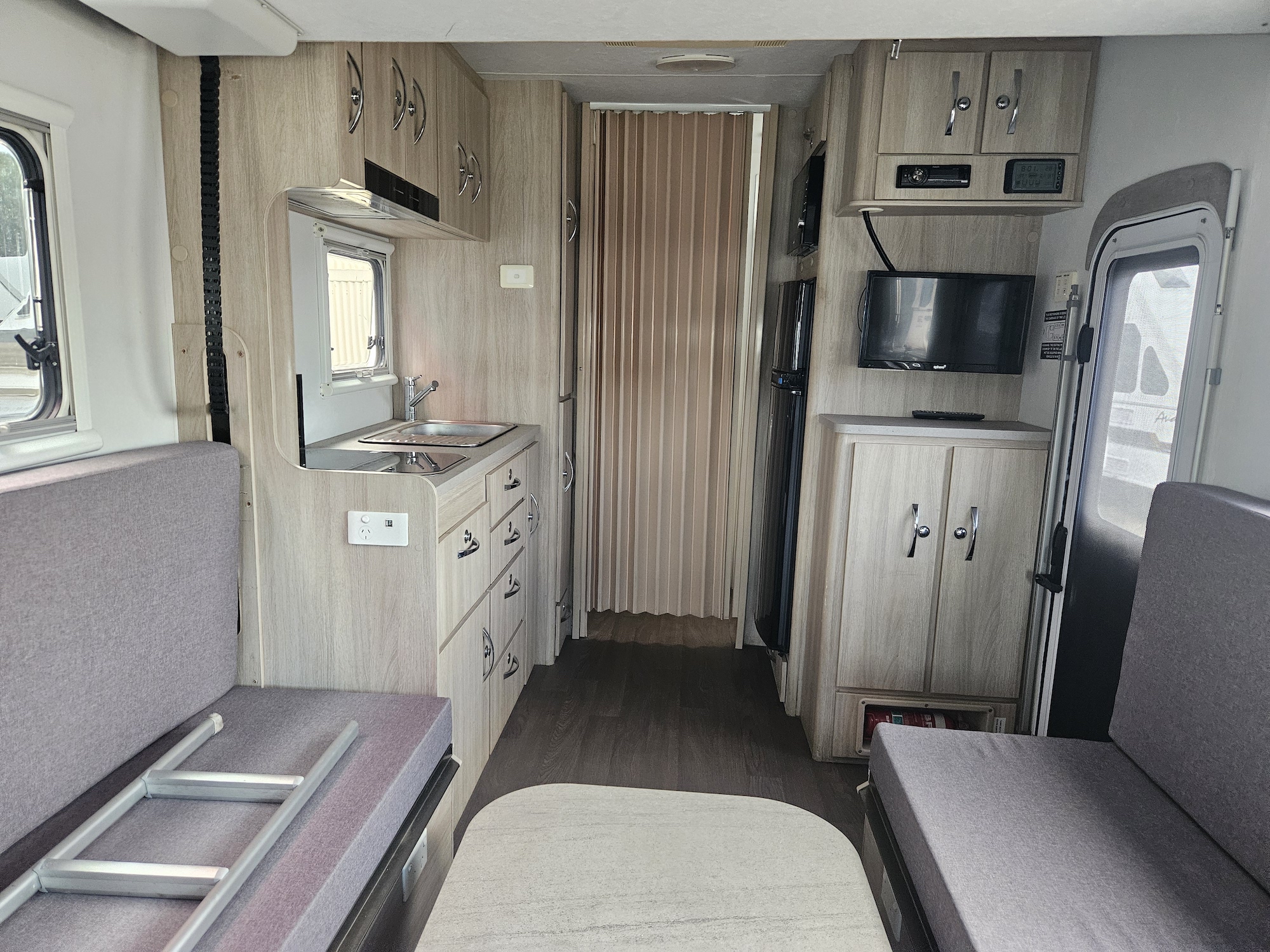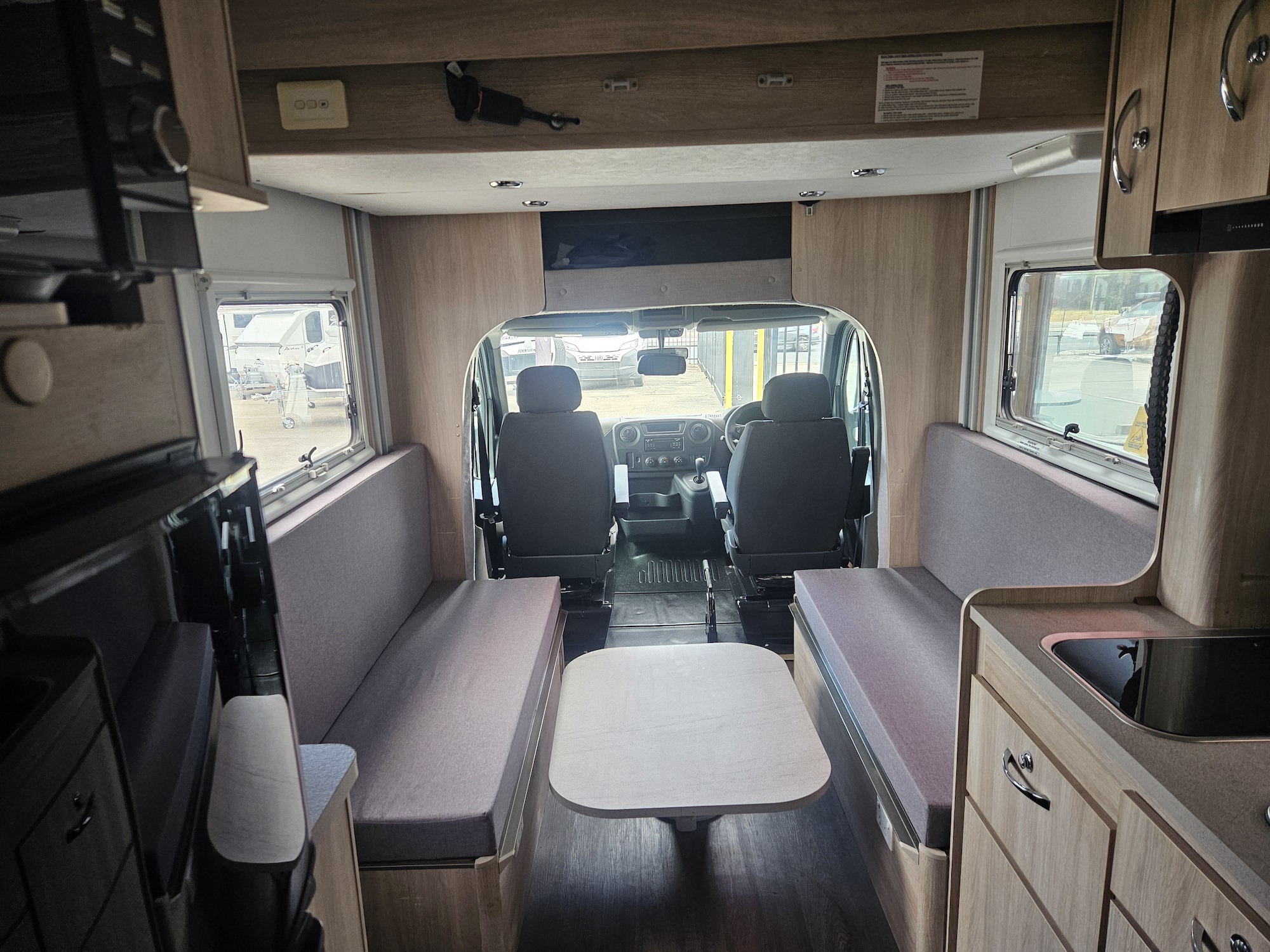 Off-grid friendly with solar power, house battery, fresh and grey water tanks, plus gas and electric hot water. Outside, enjoy the Fiamma awning, external storage, outdoor 12V TV point and electric step for easy access.
