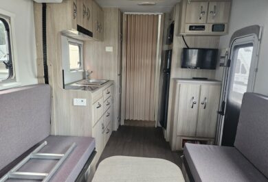 Inside, it’s all about comfort for two. The electric bedclub lounge and full ensuite with separate shower and toiletmake longer trips a breeze. The kitchen is well set up with a large 177L 3-way fridge with separate freezer, gas cooktop, microwave and plenty of storage – everything you need for relaxed road trips.