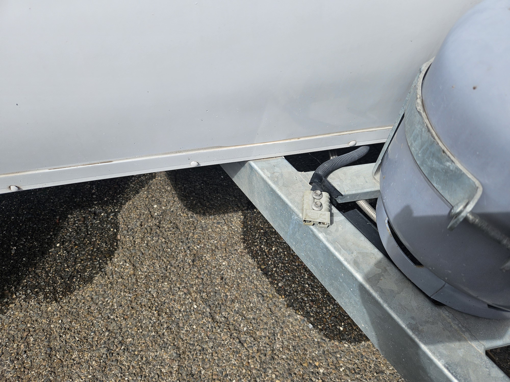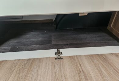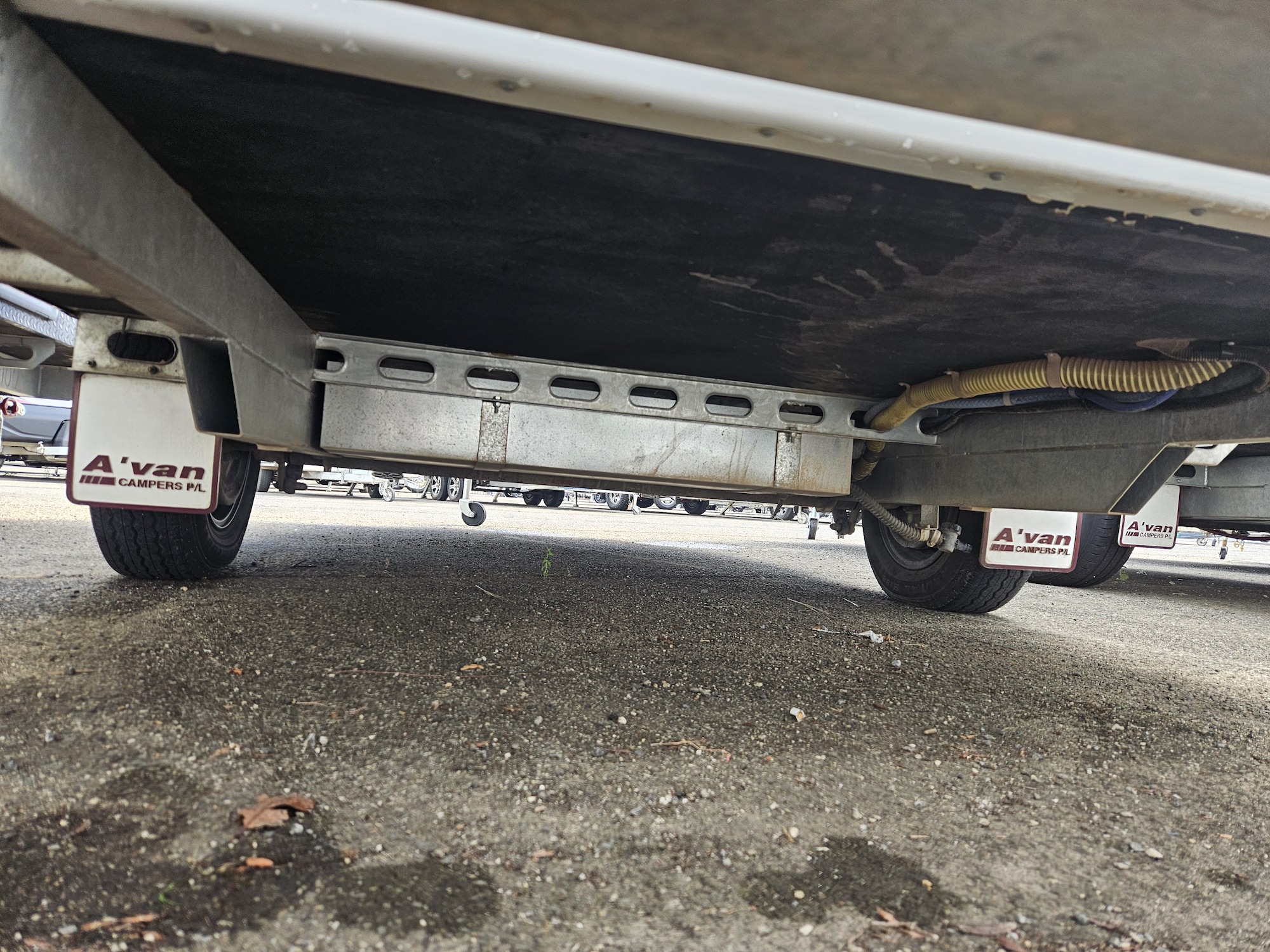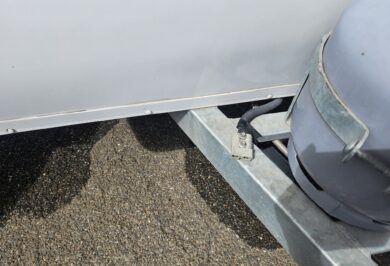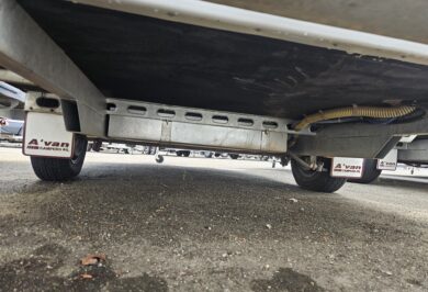 Outside, it’s ready to go with a front boot, jockey wheel, stabiliser legs, pole holder, outside shower, 80 watt solar panel, battery and 2 x 4.5kg gas bottles.