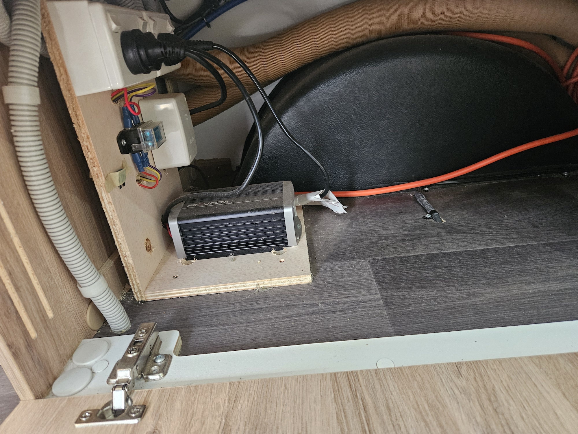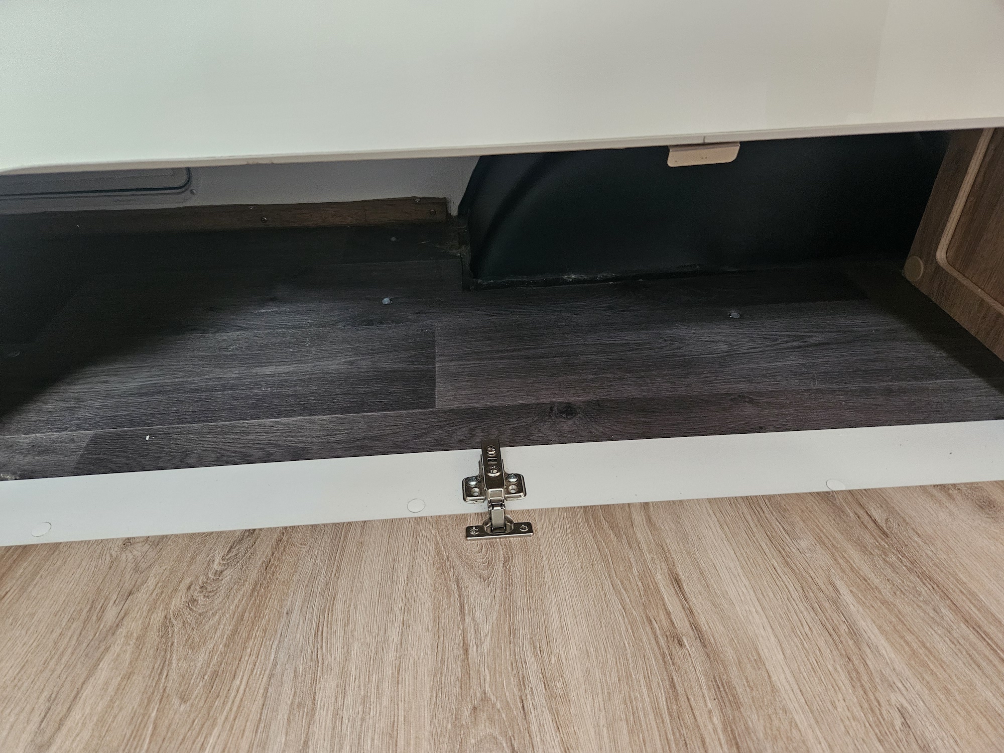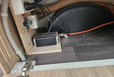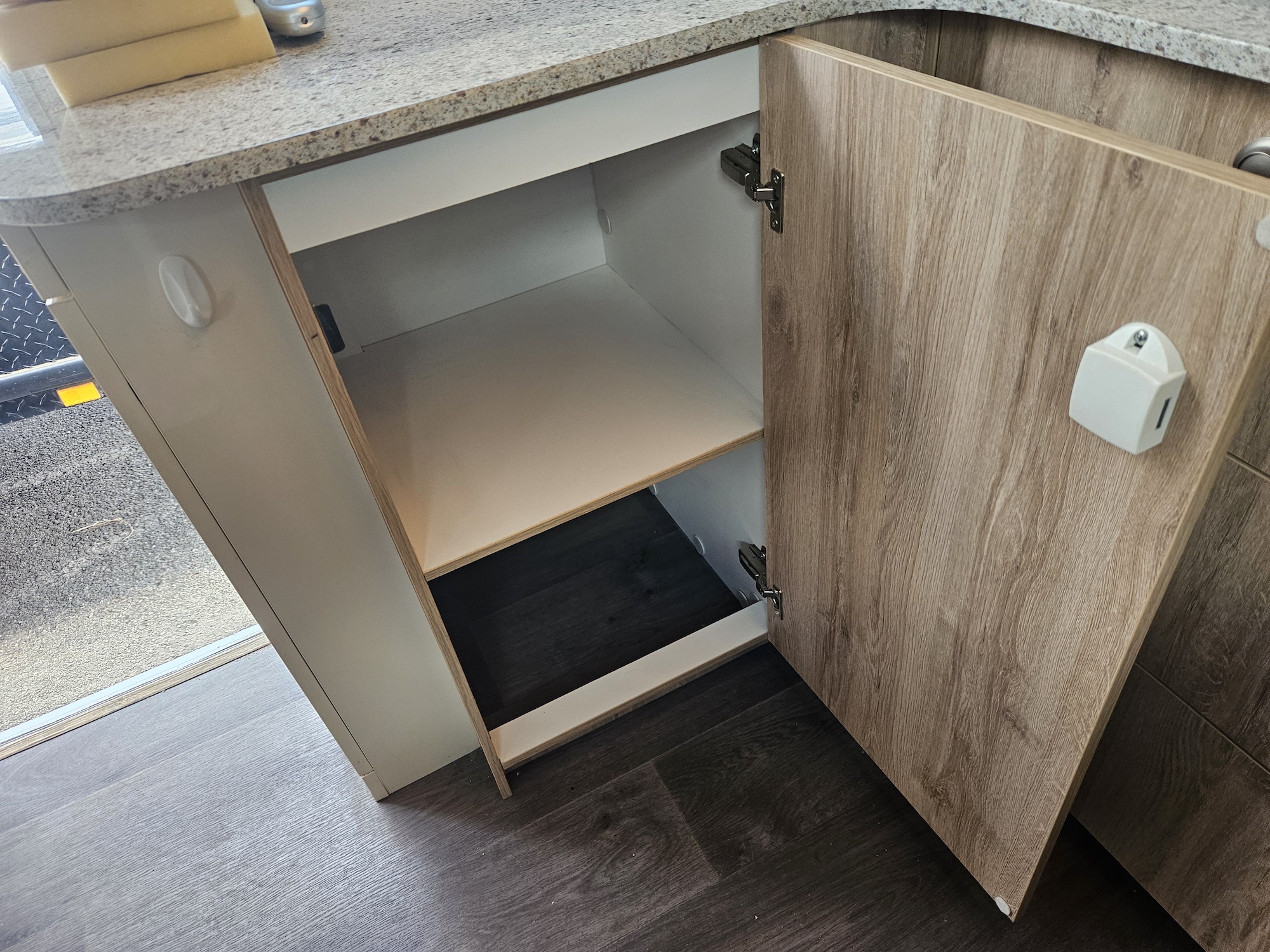 Outside, it’s ready to go with a front boot, jockey wheel, stabiliser legs, pole holder, outside shower, 80 watt solar panel, battery and 2 x 4.5kg gas bottles.