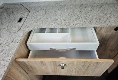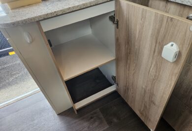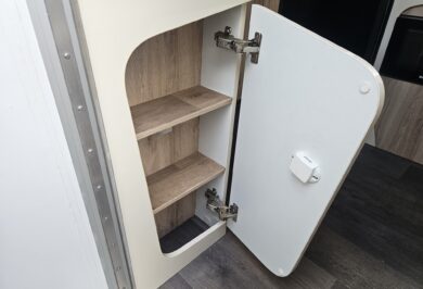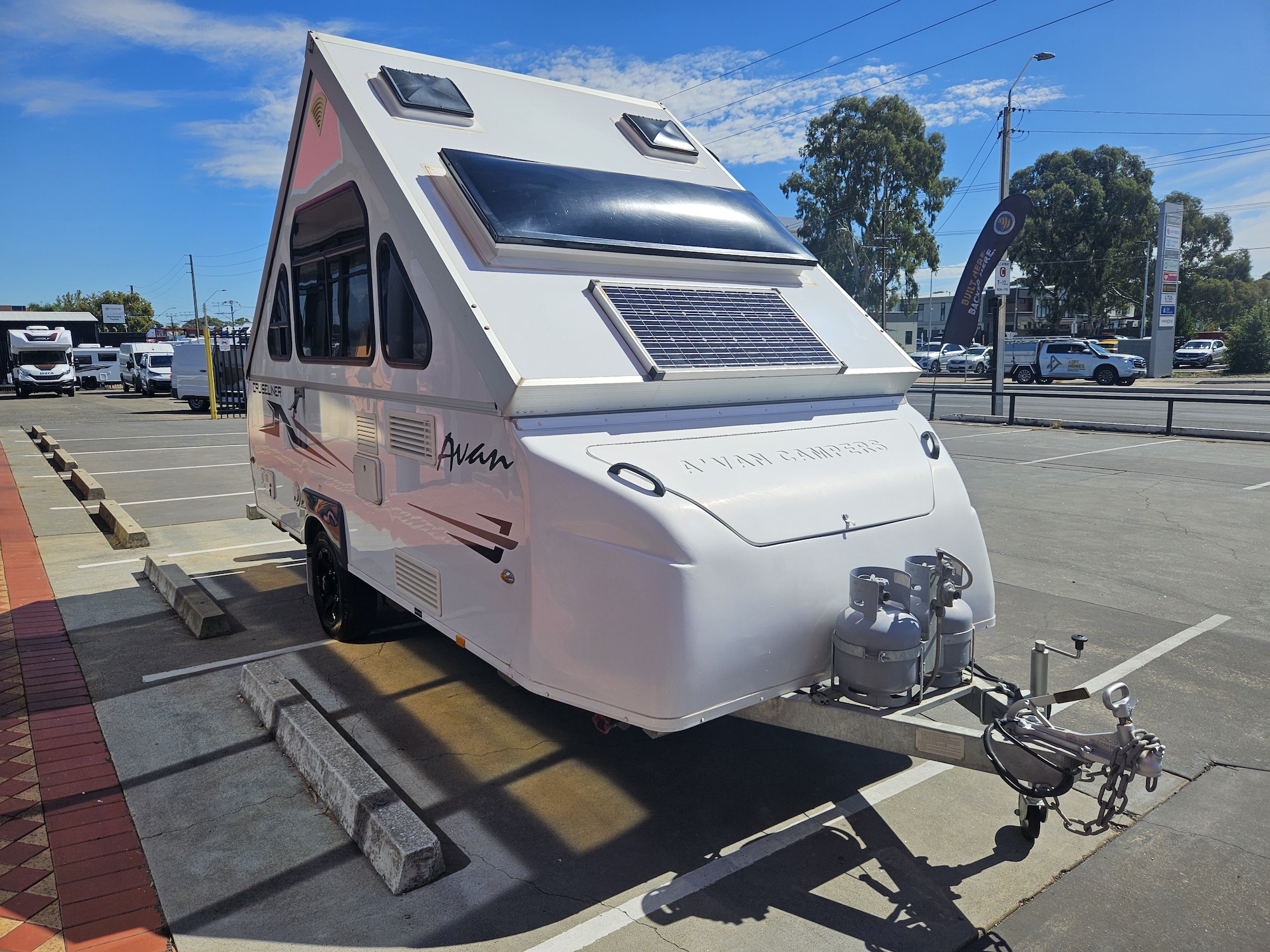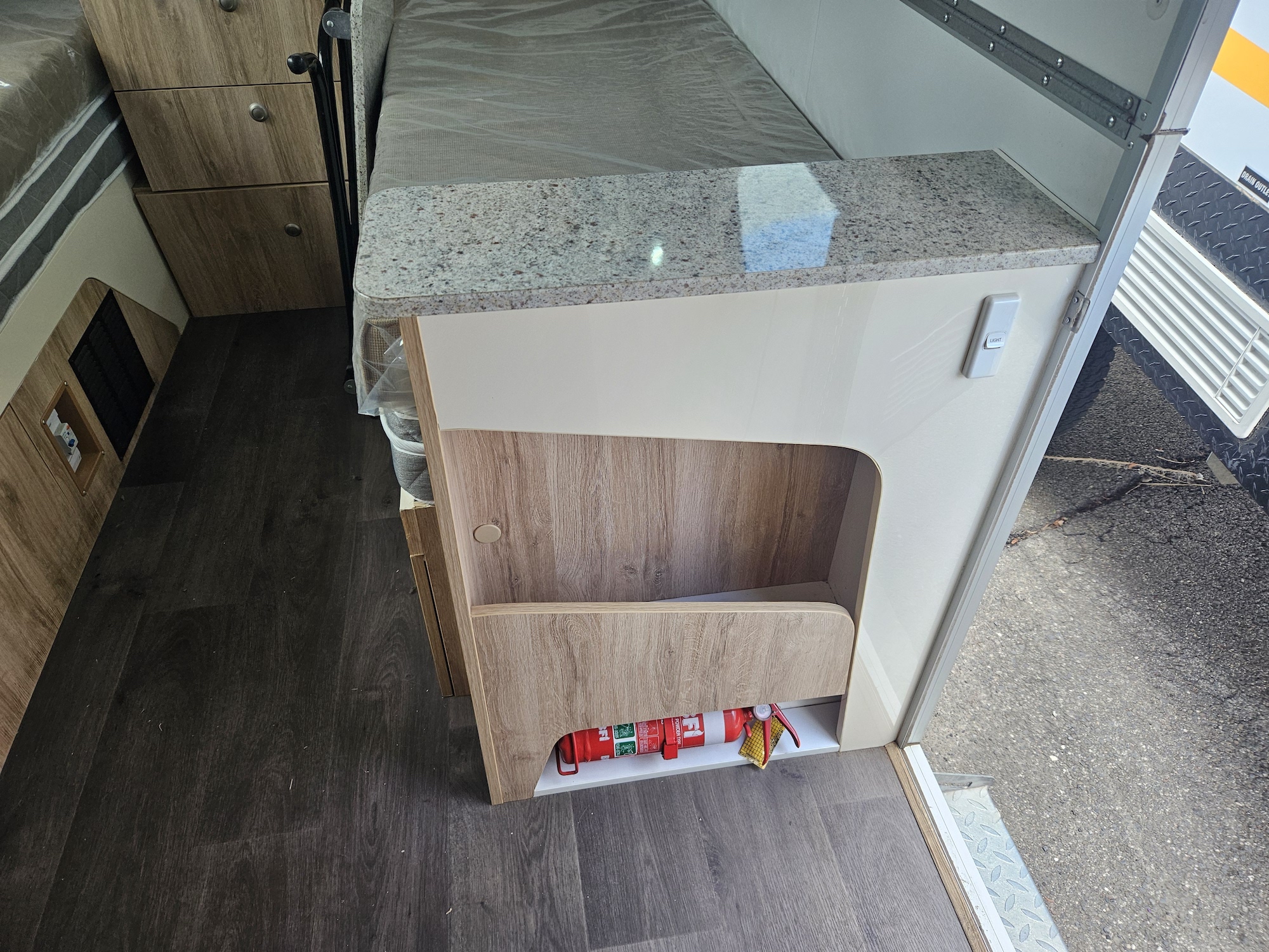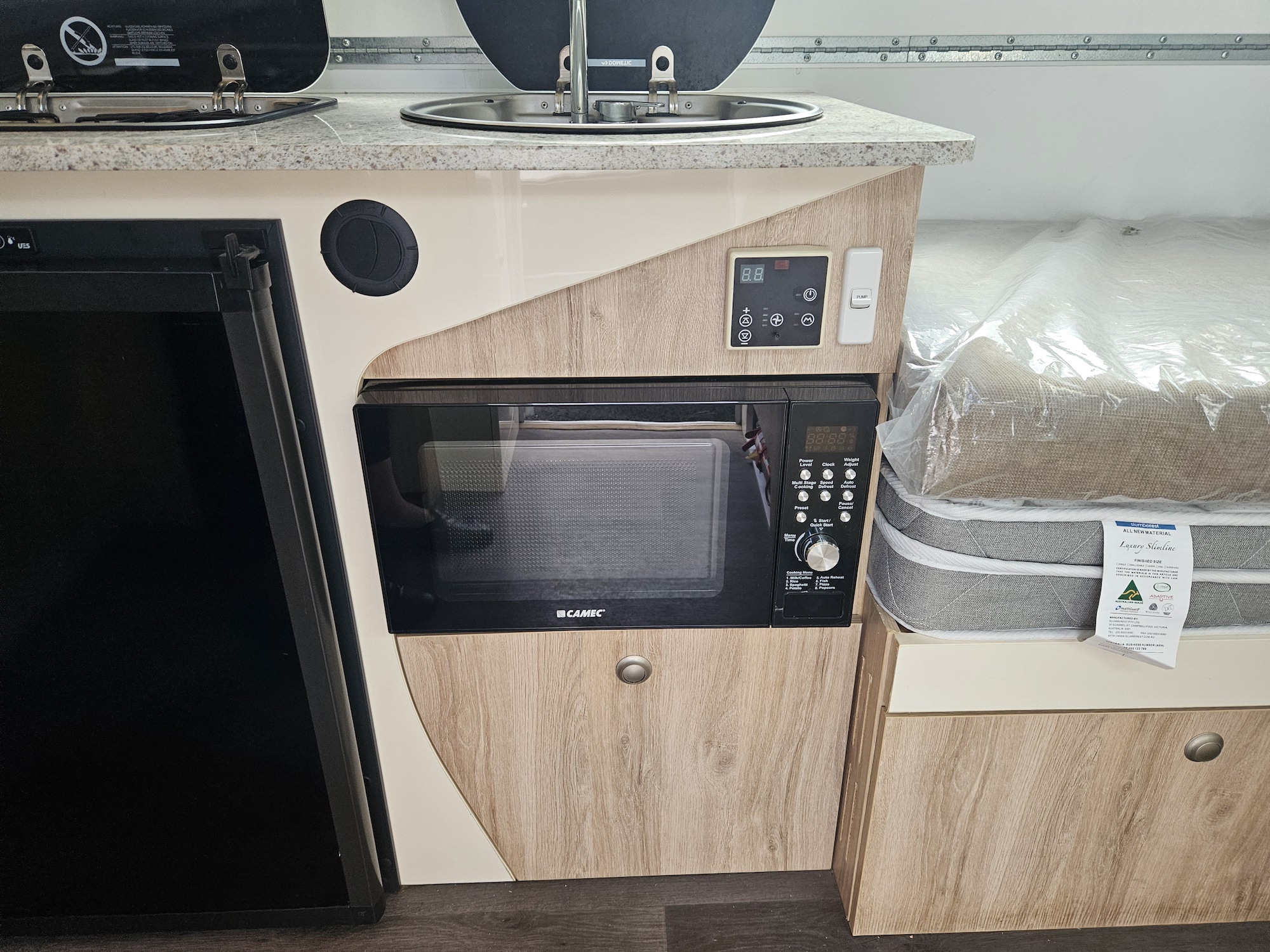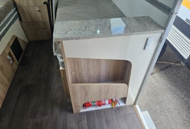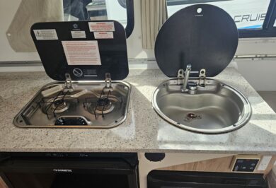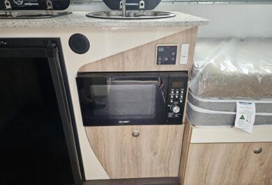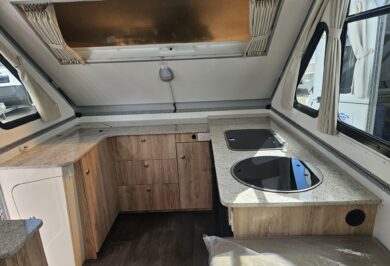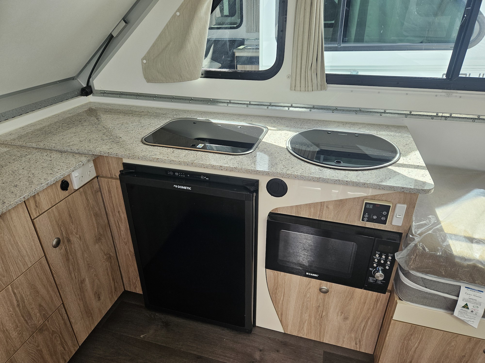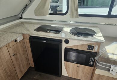 Inside, it’s set up for comfort with two single beds with innerspring mattresses, a small wardrobe and practical storage. The kitchen includes a 2 gas cooktop, sink, microwave and a Dometic 3 way fridge with a small freezer, along with electric hot water.