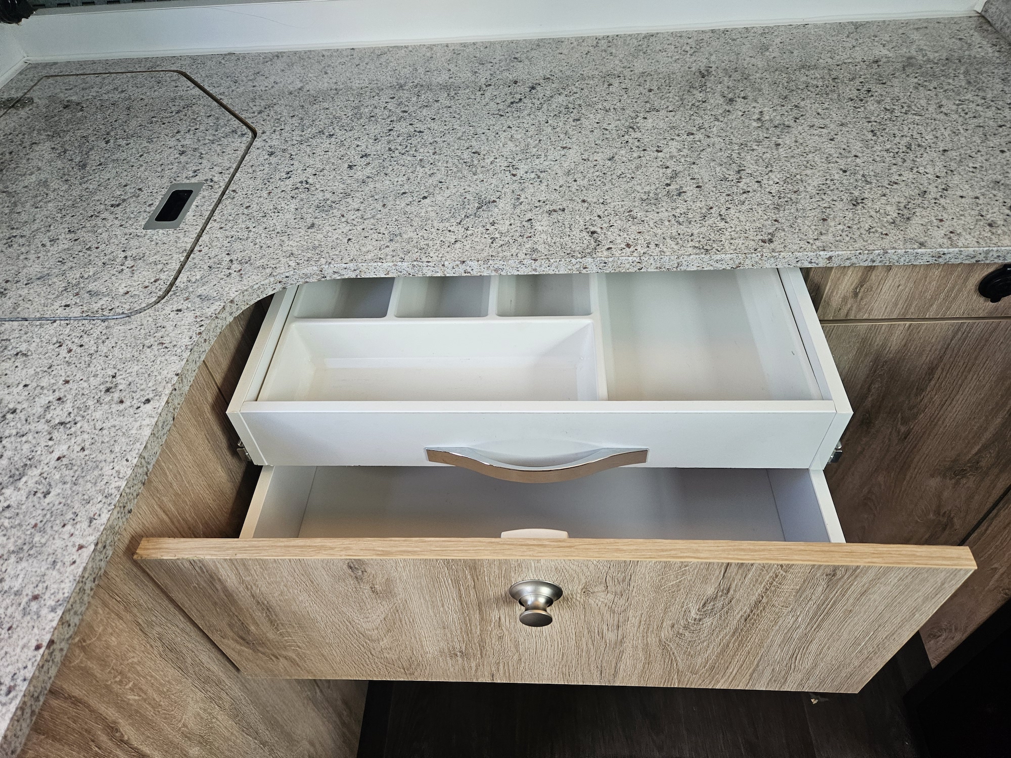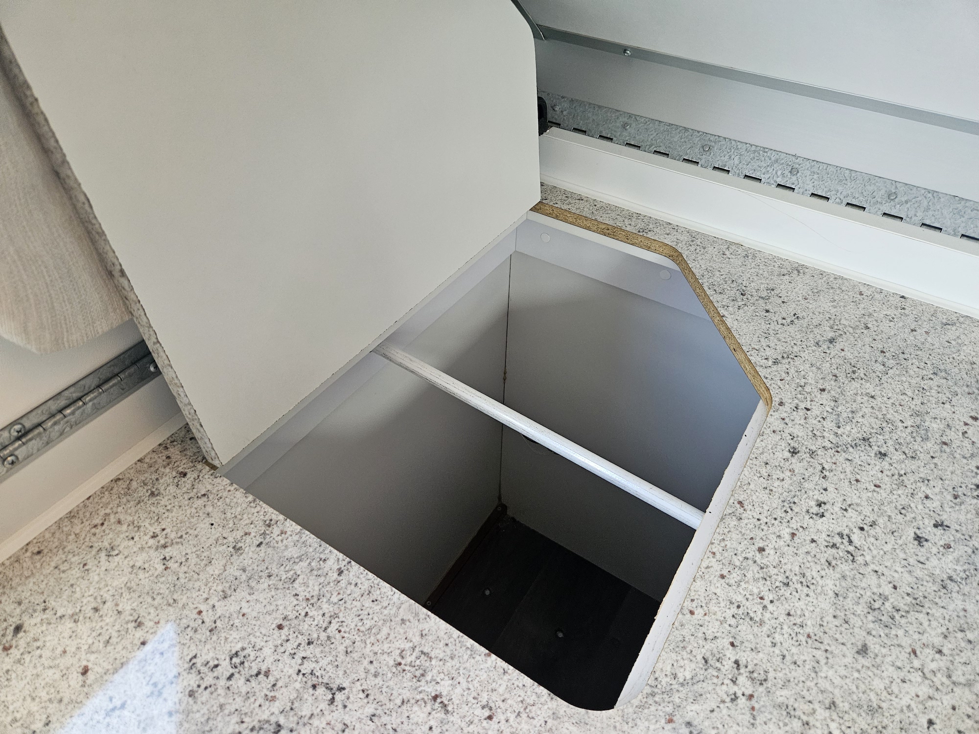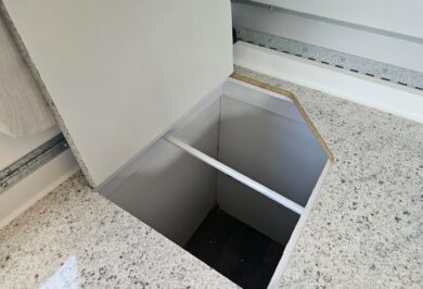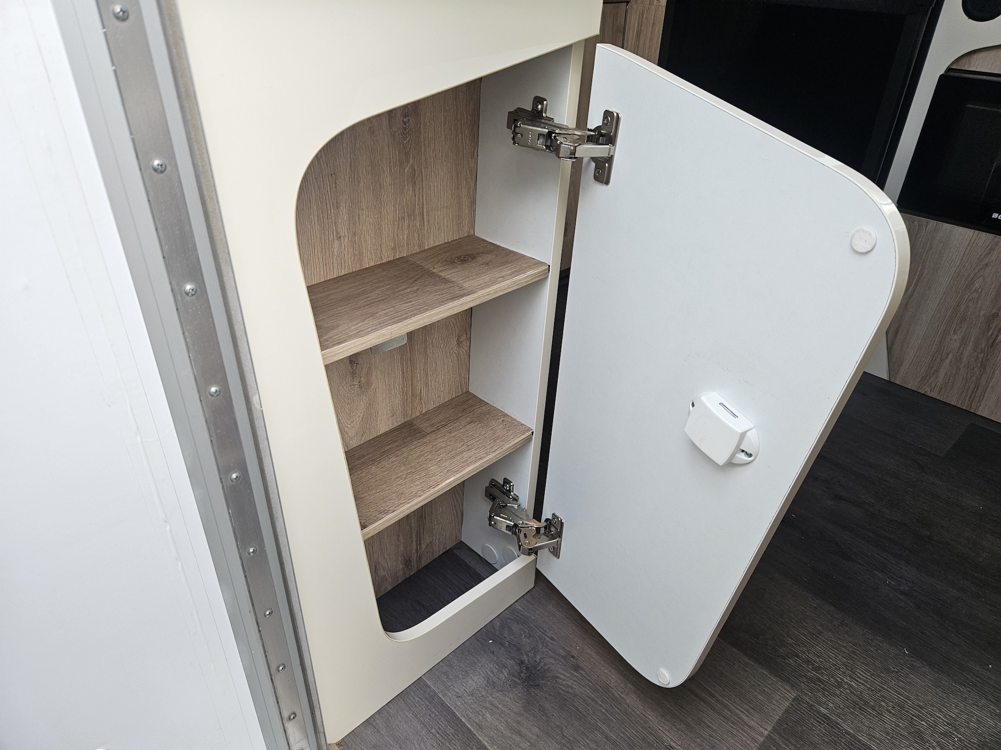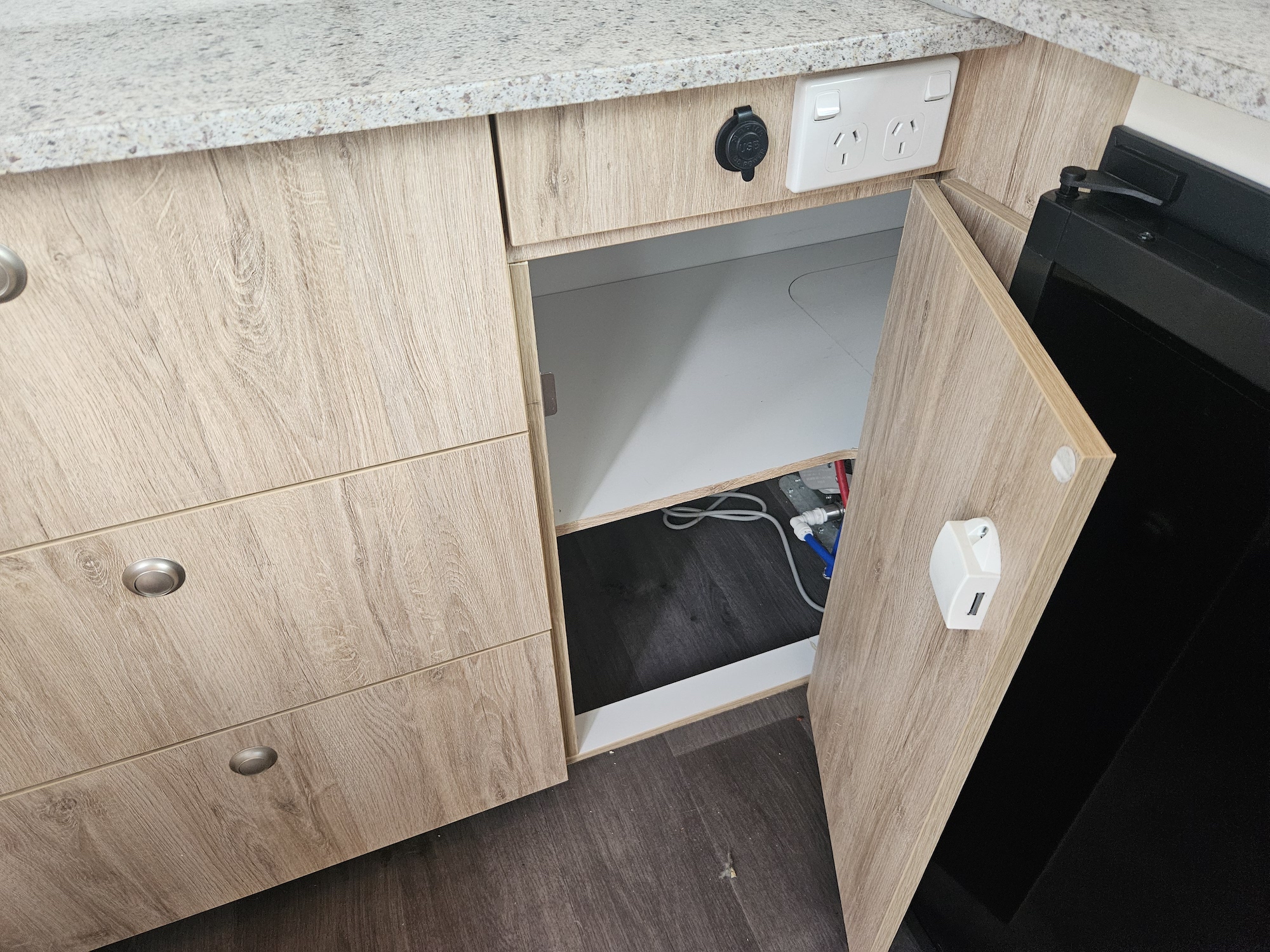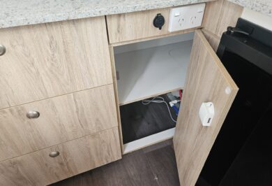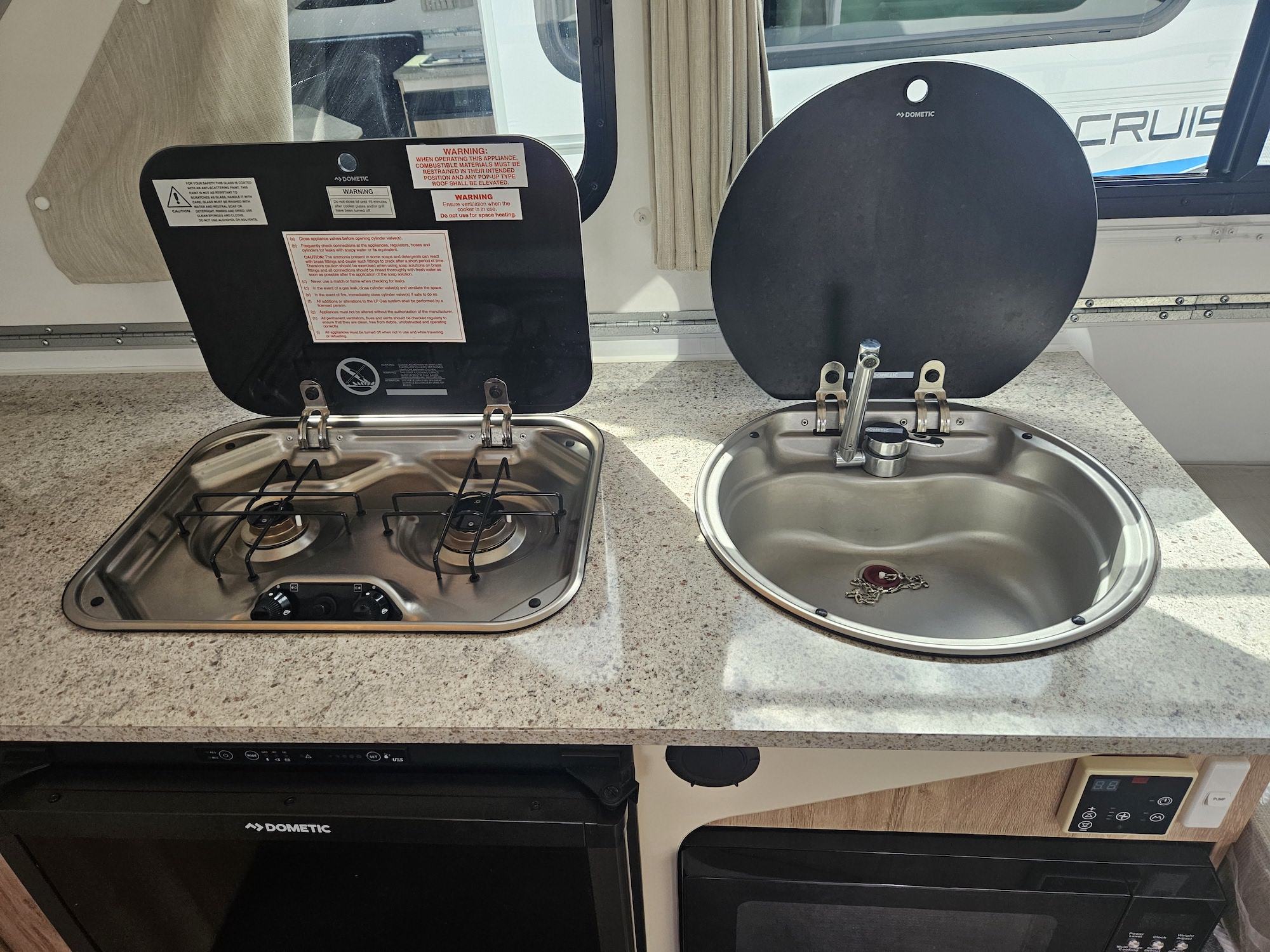 Inside, it’s set up for comfort with two single beds with innerspring mattresses, a small wardrobe and practical storage. The kitchen includes a 2 gas cooktop, sink, microwave and a Dometic 3 way fridge with a small freezer, along with electric hot water.