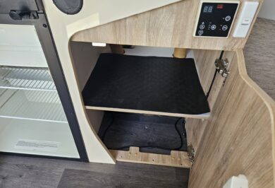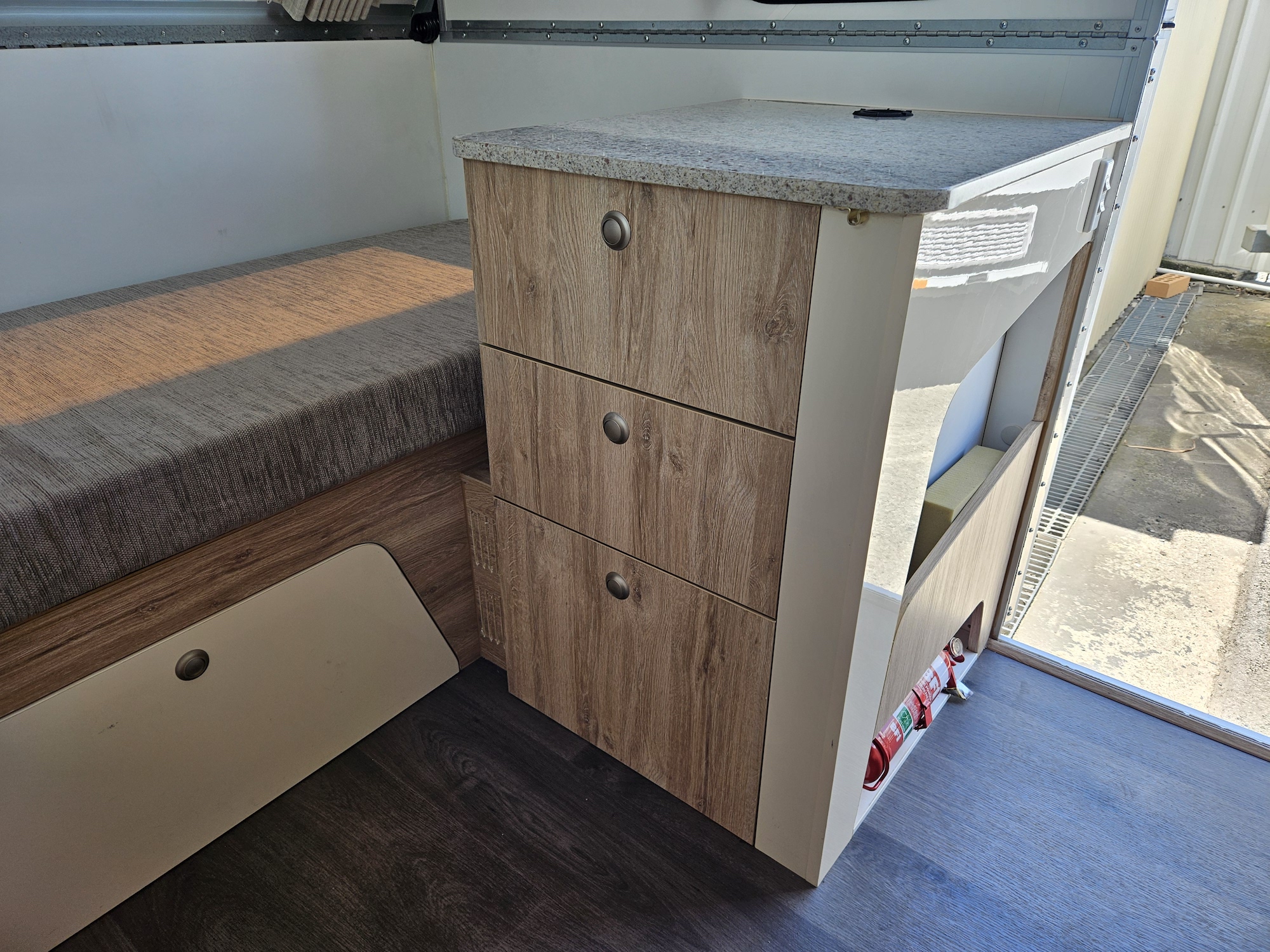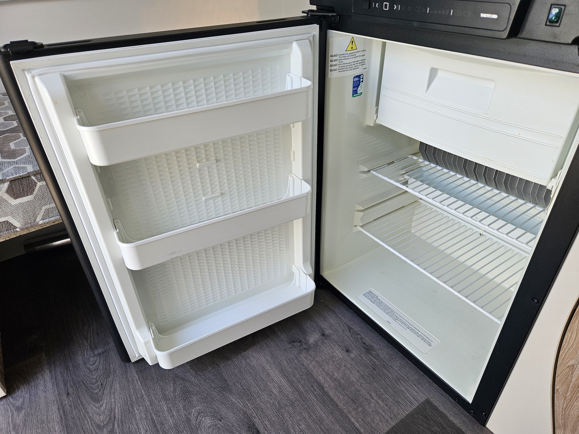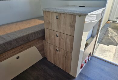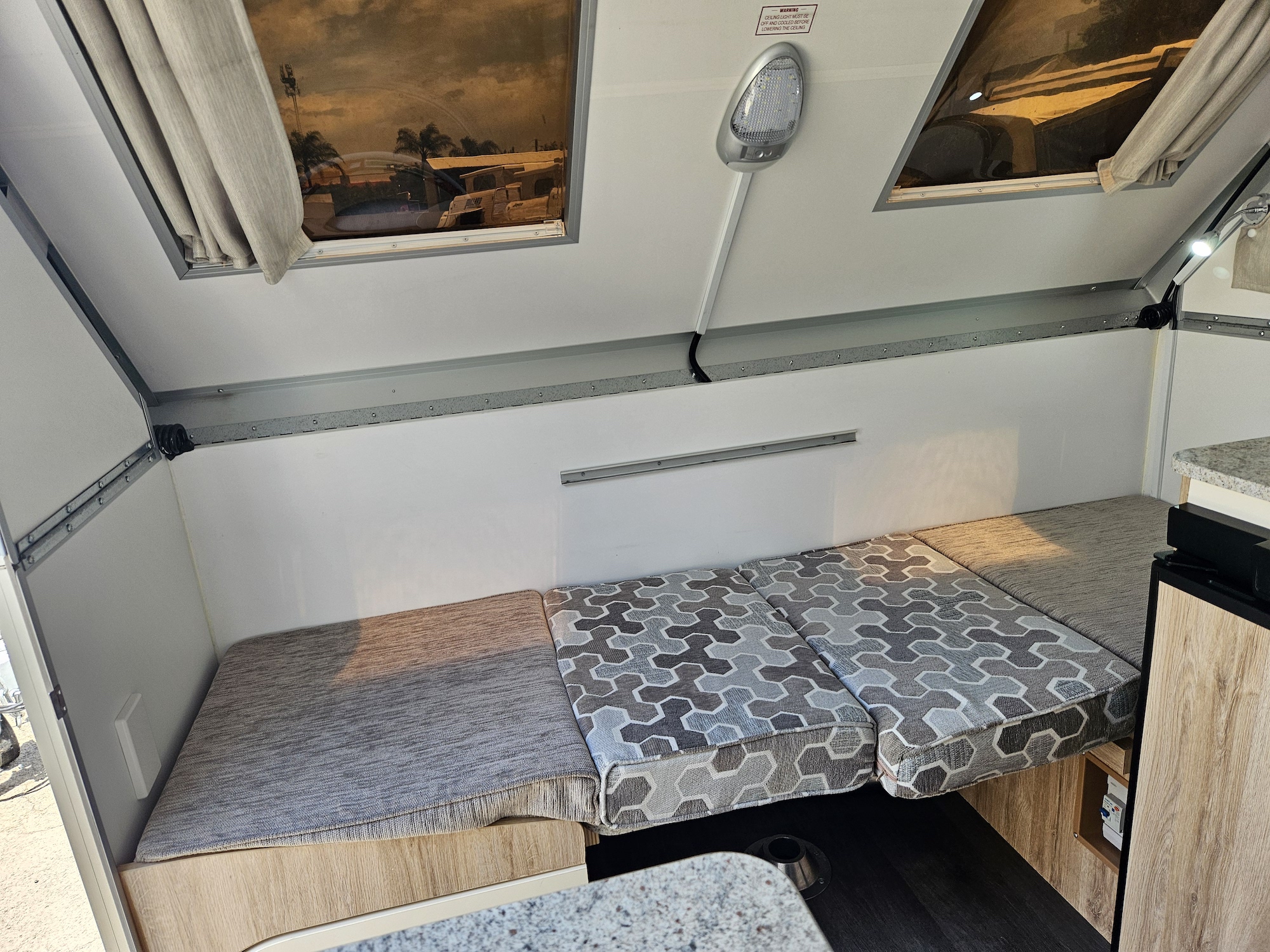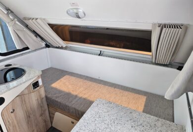 Comfortably sleeping two, the interior includes café seating that converts to a bed, a practical kitchen setup, fridge, heating and cooling, and all the essentials for relaxed touring. Outside, there’s space to enjoy the surroundings with a picnic table and practical storage.