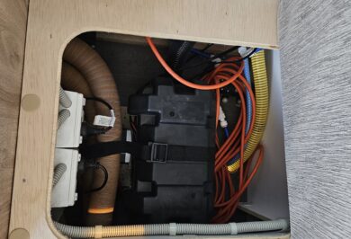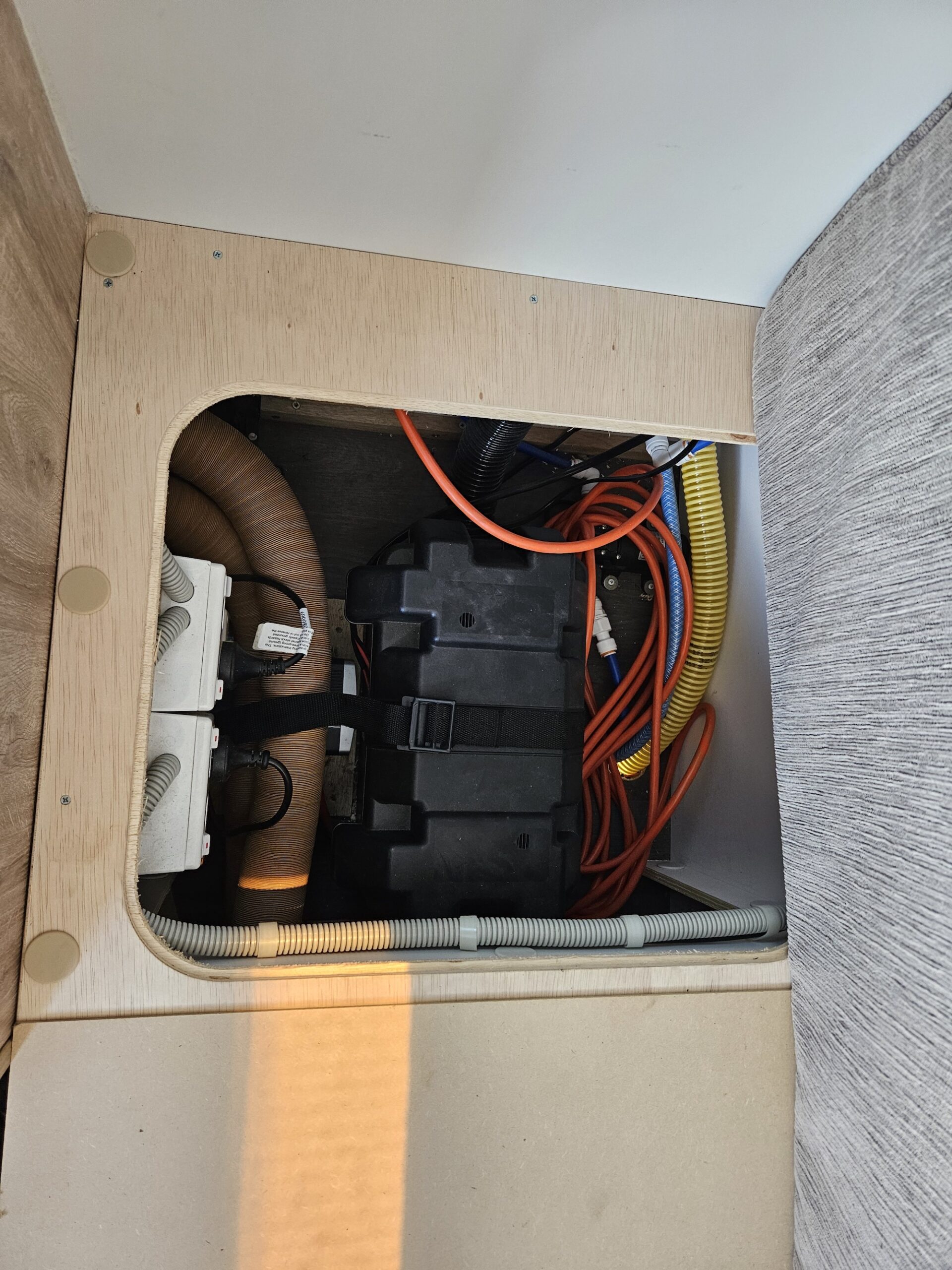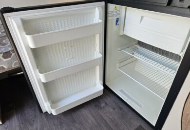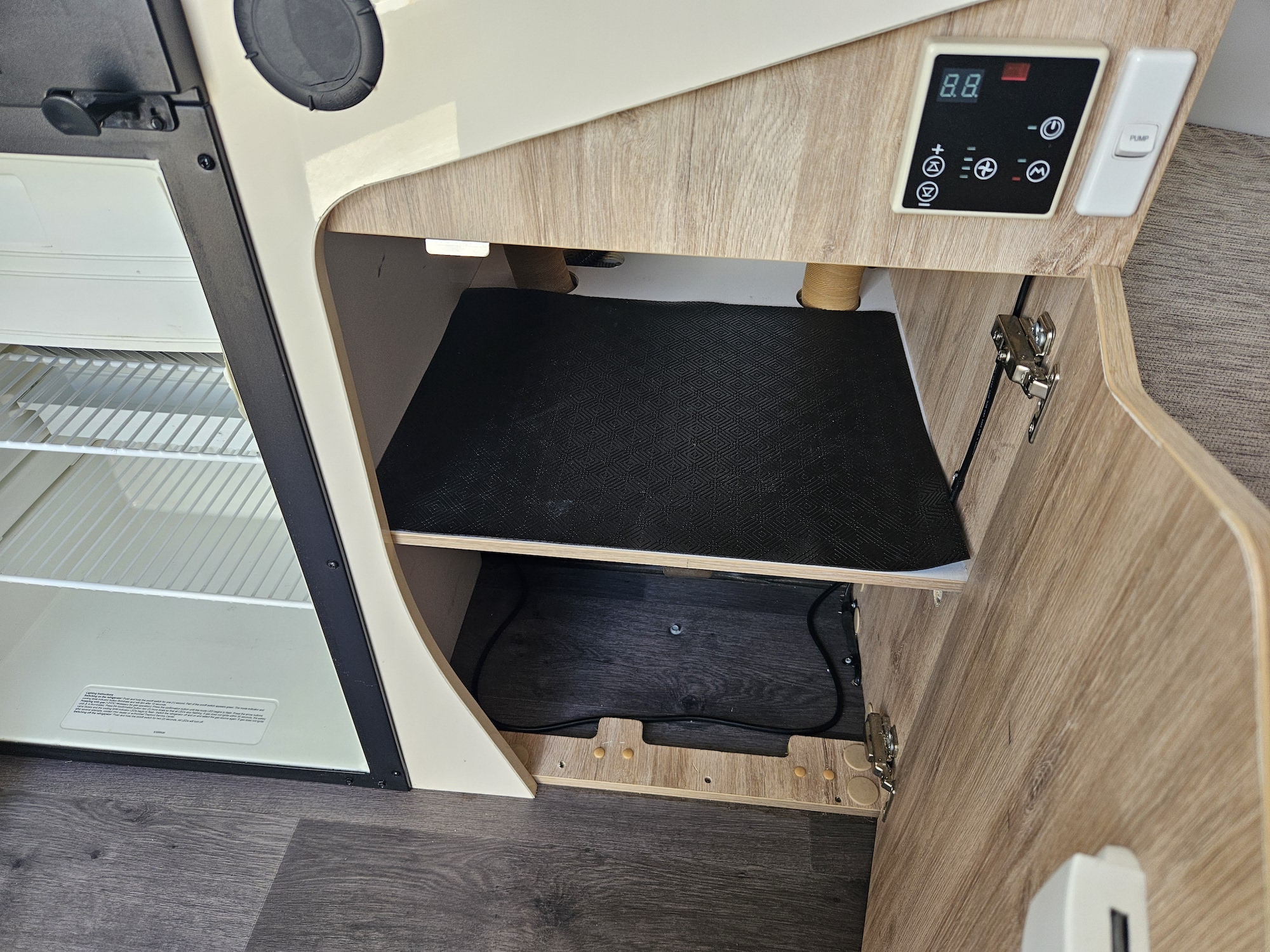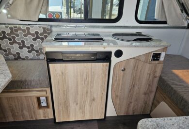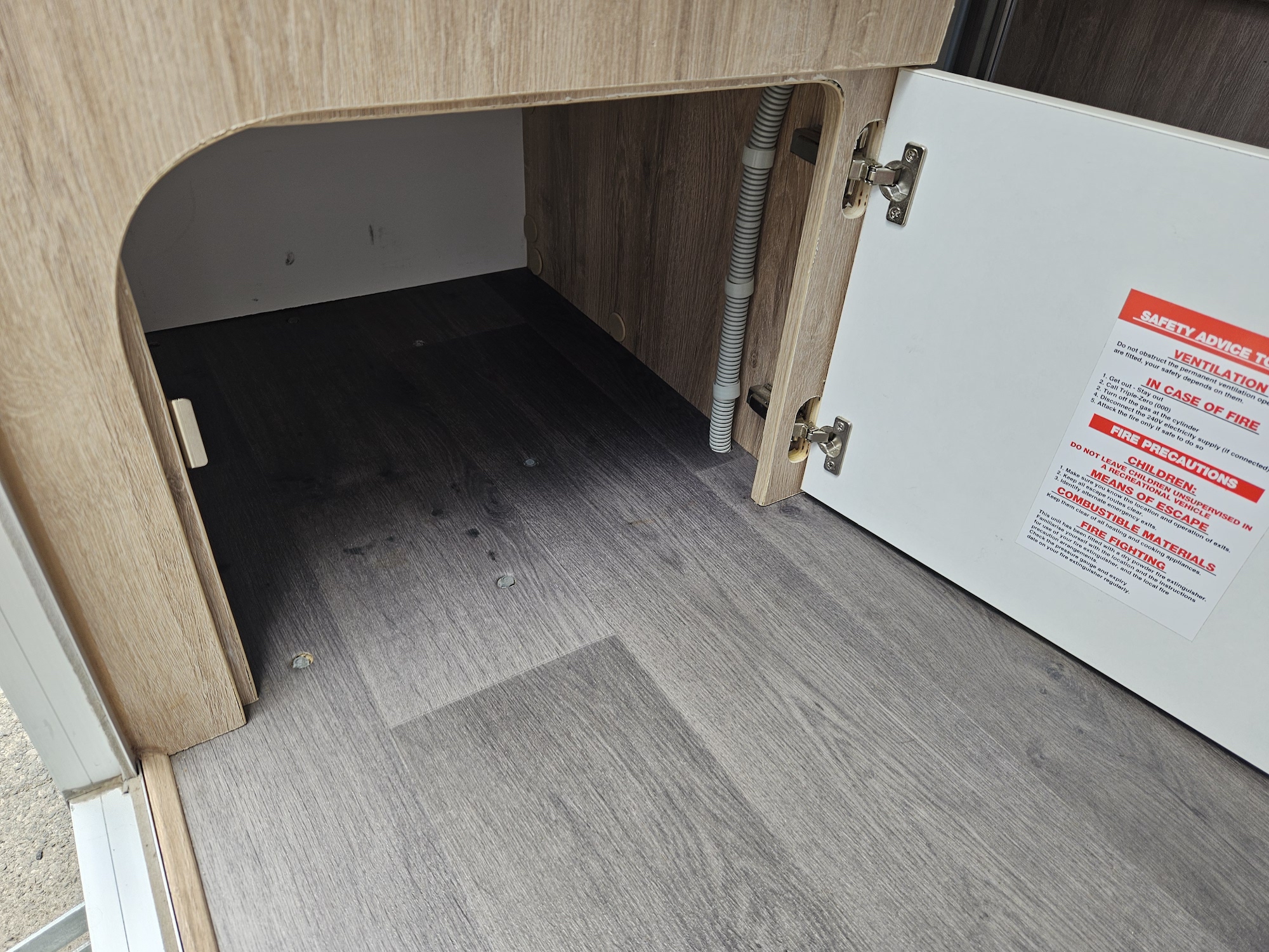 Comfortably sleeping two, the interior includes café seating that converts to a bed, a practical kitchen setup, fridge, heating and cooling, and all the essentials for relaxed touring. Outside, there’s space to enjoy the surroundings with a picnic table and practical storage.