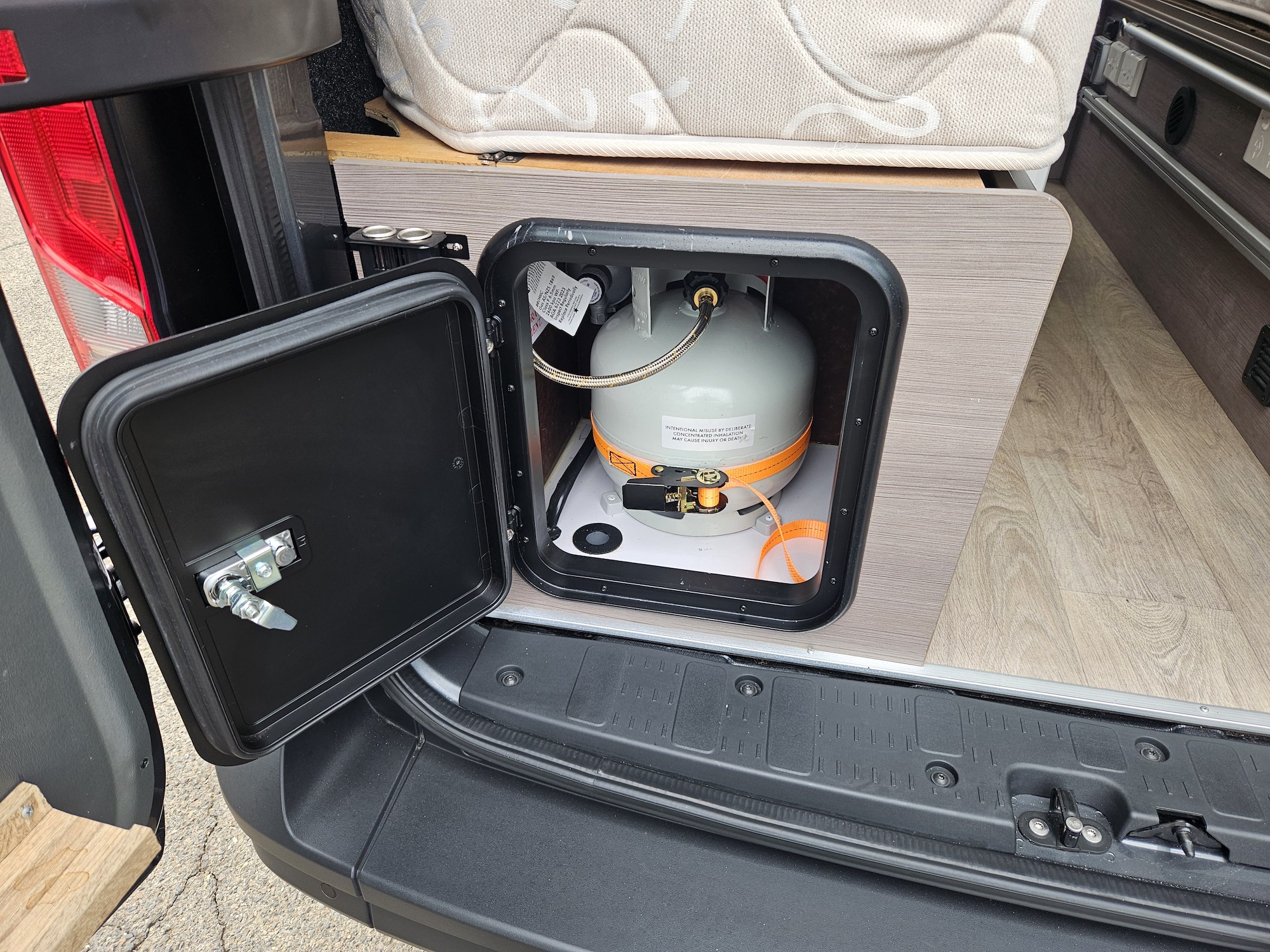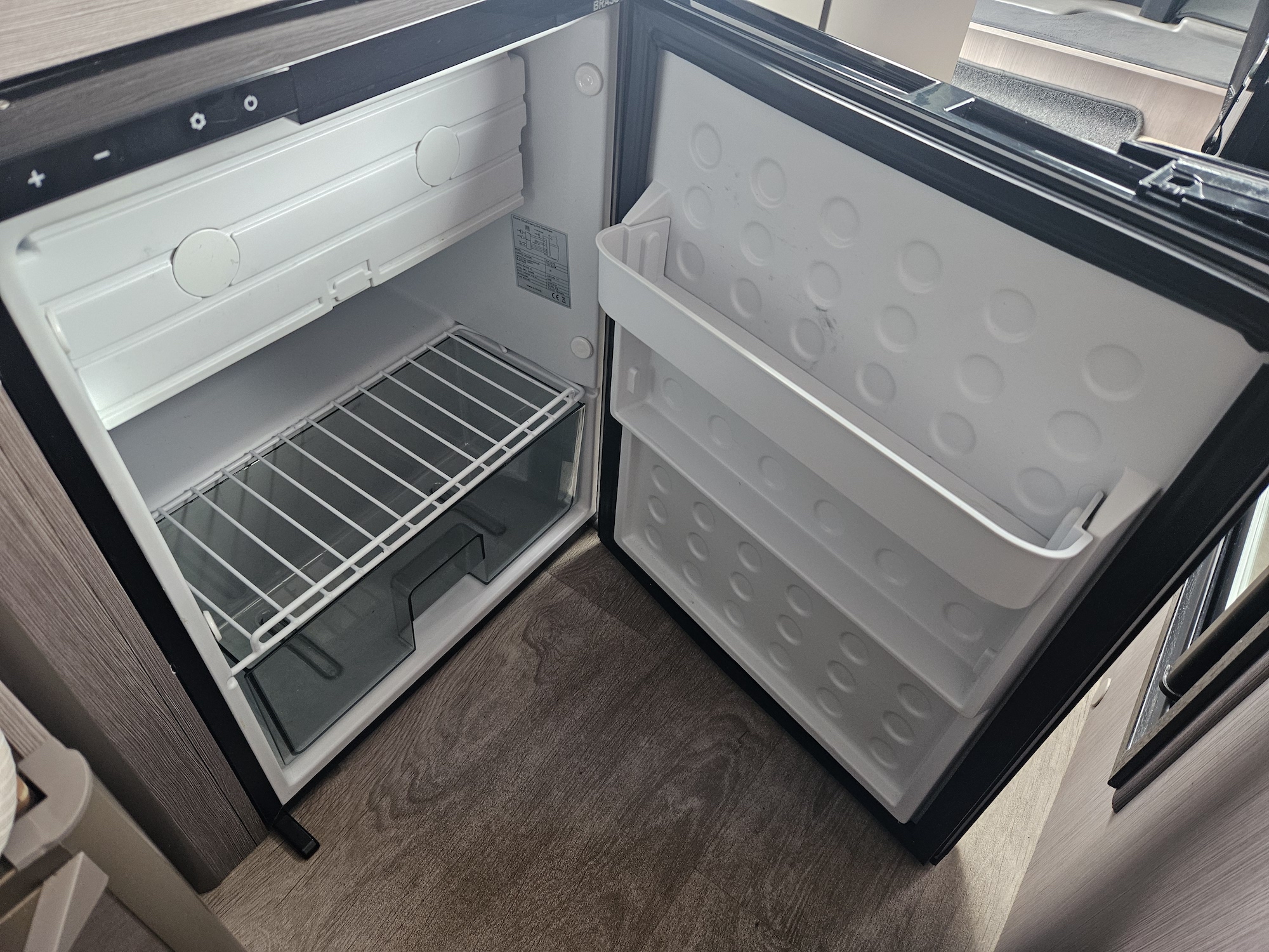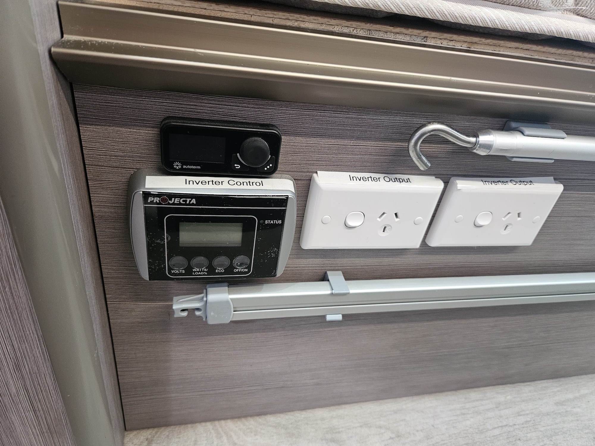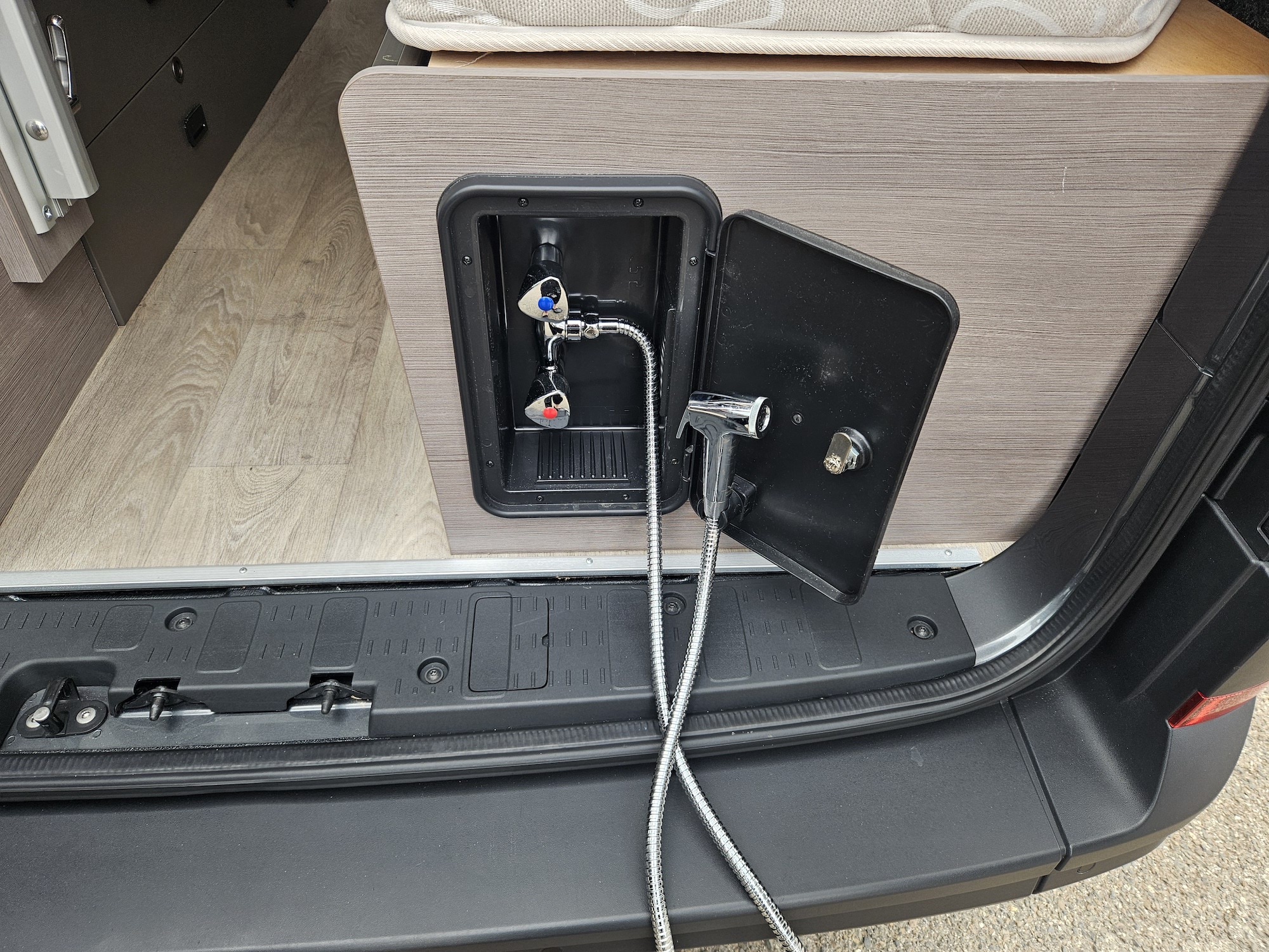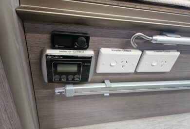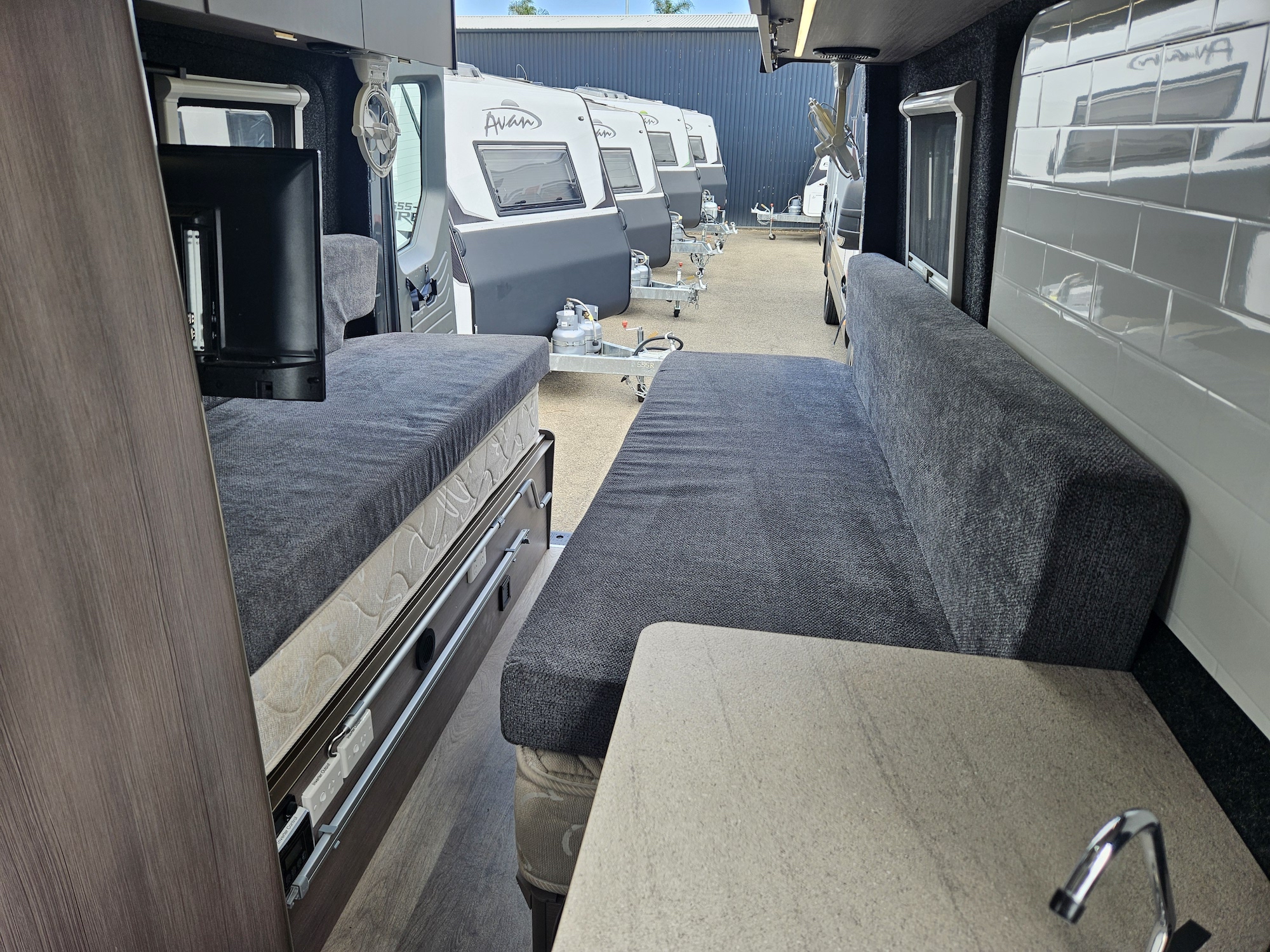 Outside, it’s ready to go with an awning, swing out step, external speakers, solar panel, reversing camera and outside shower. It also includes gas electric hot water, a 120 watt lithium battery and a 4.5kg gas bottle.