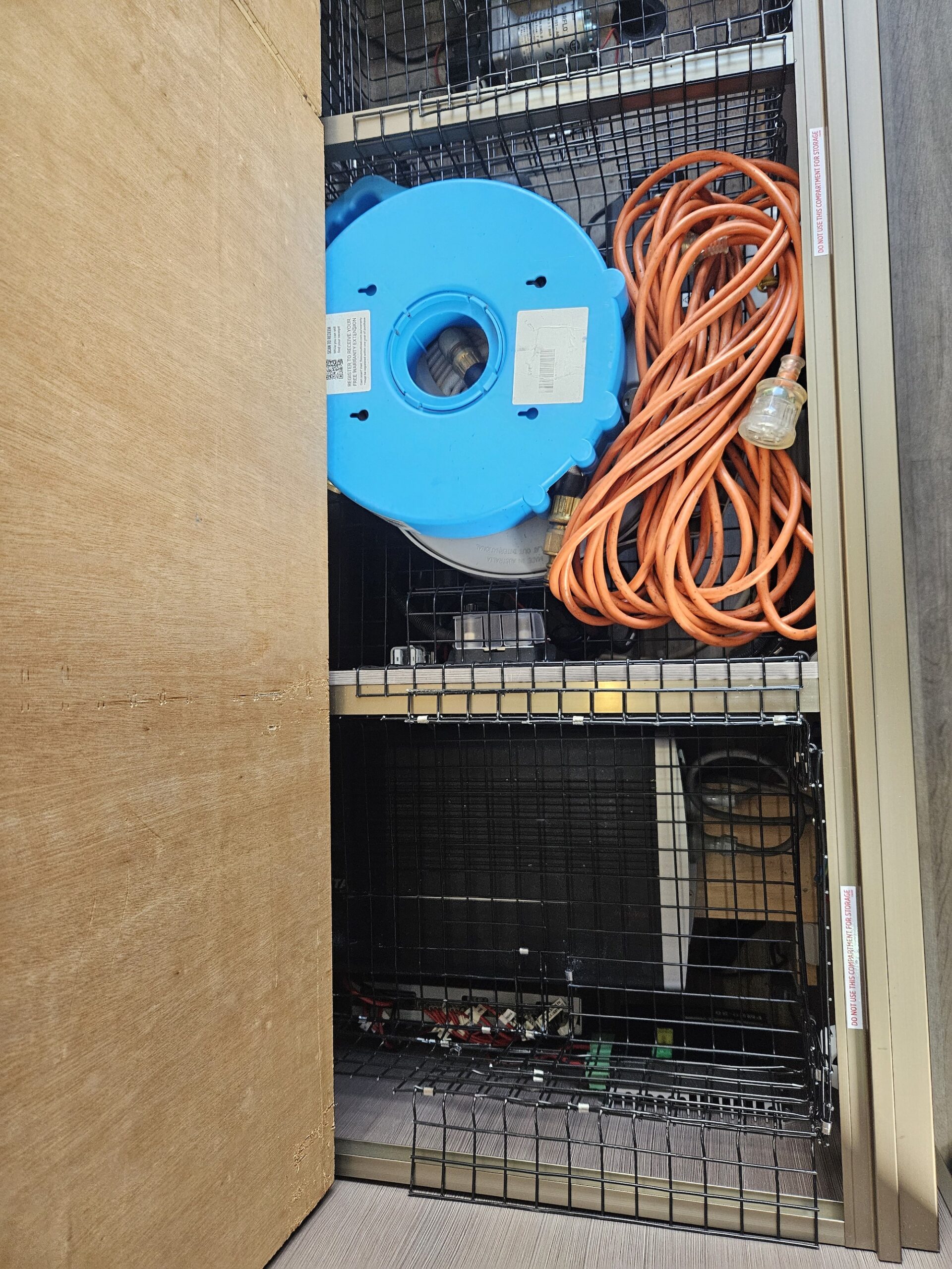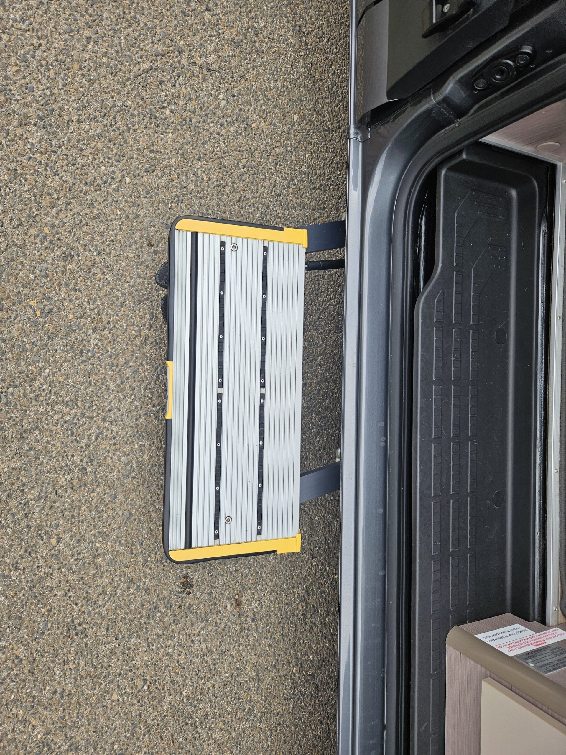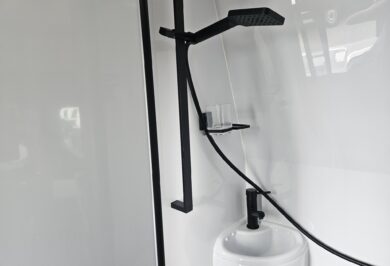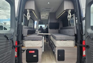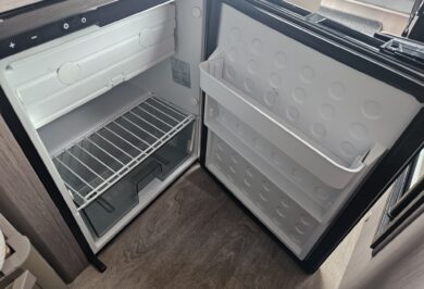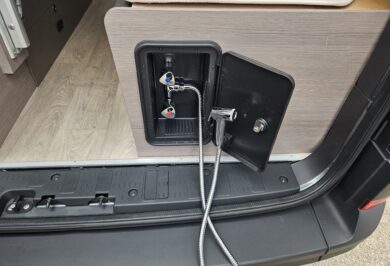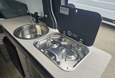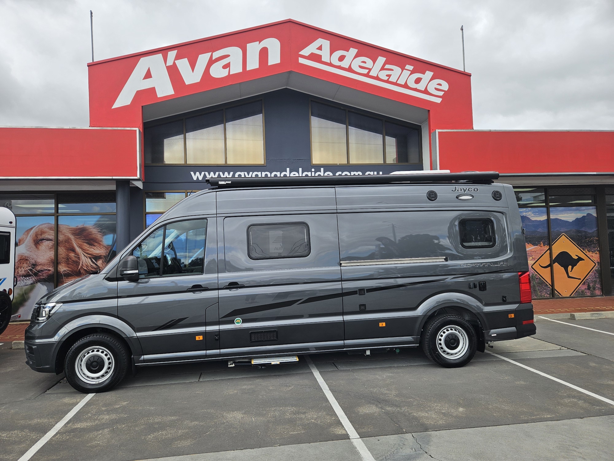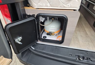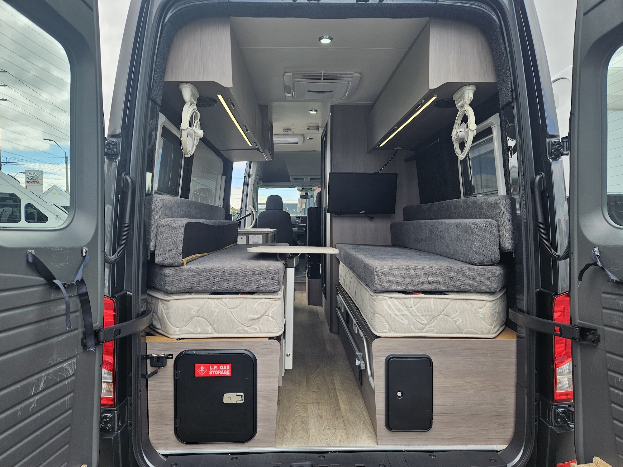 Outside, it’s ready to go with an awning, swing out step, external speakers, solar panel, reversing camera and outside shower. It also includes gas electric hot water, a 120 watt lithium battery and a 4.5kg gas bottle.
