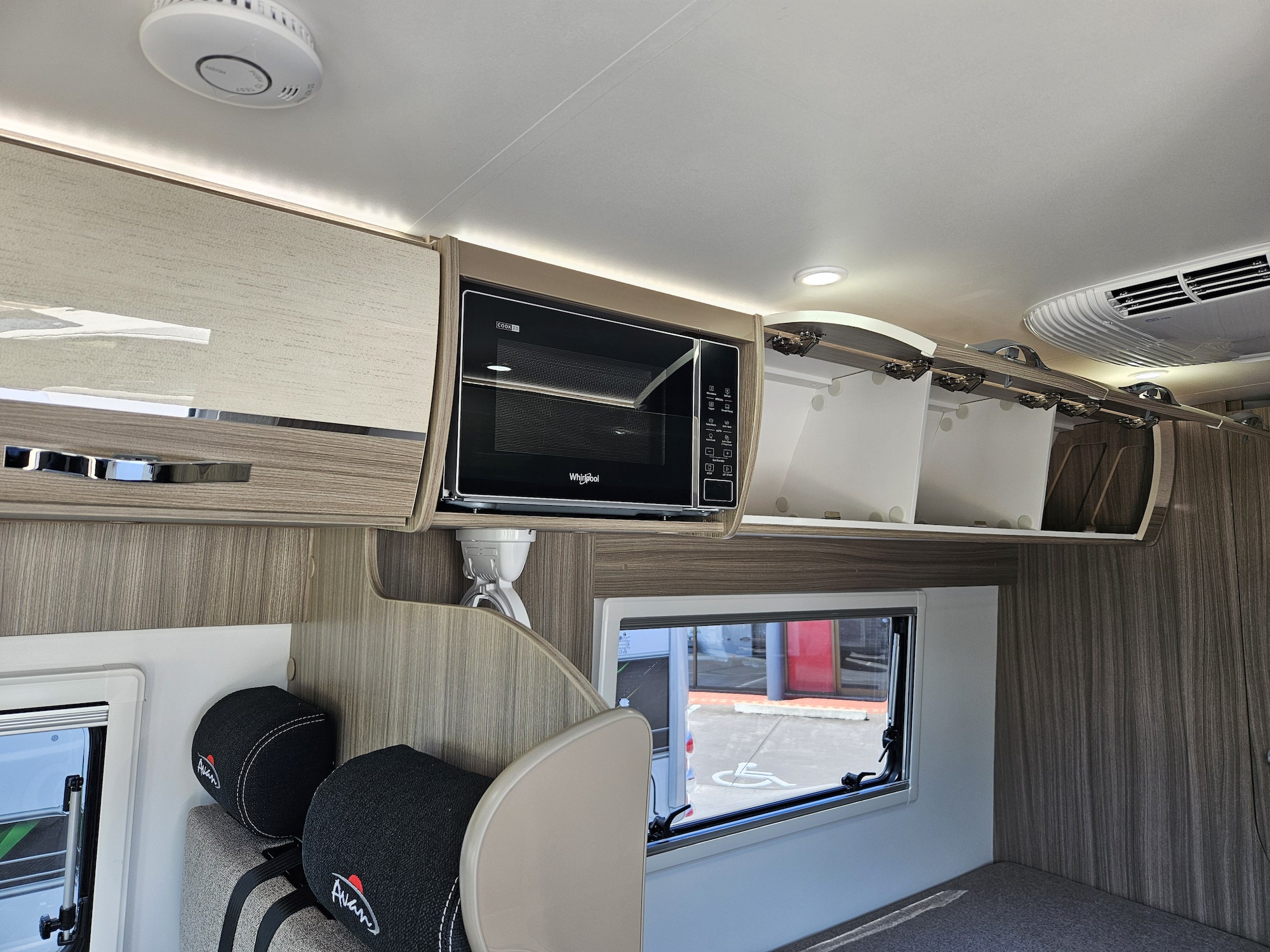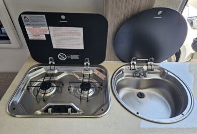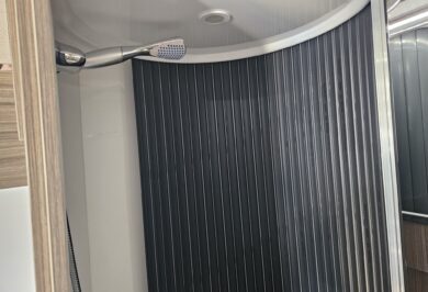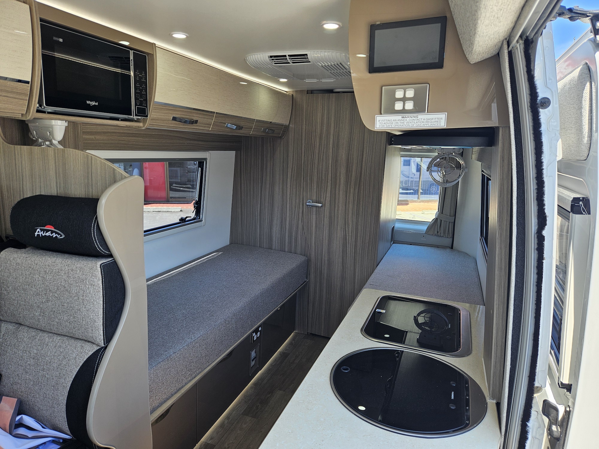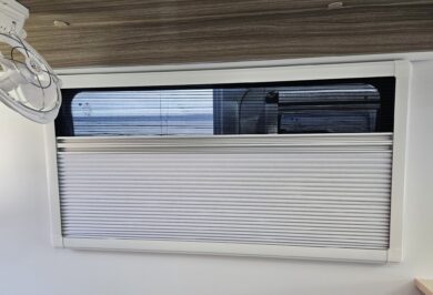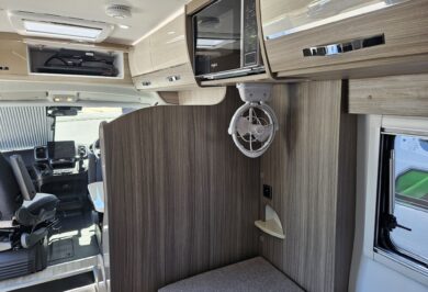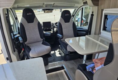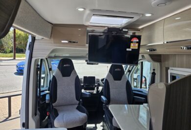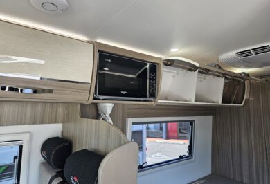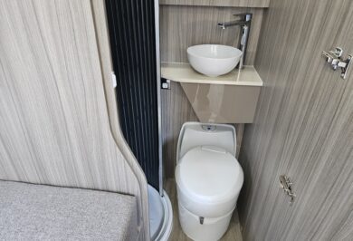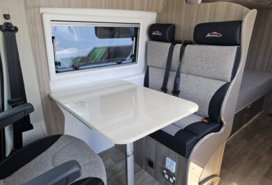 The 600-1’s twin single bed layout is perfect for travellers who prefer their own sleeping space, want easier access, or simply like a more flexible feel inside their motorhome. With overhead cupboards, generous under-bed storage and double-glazed windows with integrated blinds, it’s a comfortable, light-filled space that works beautifully on long road trips and short weekends away.