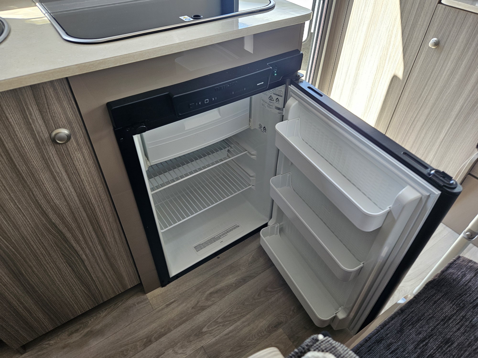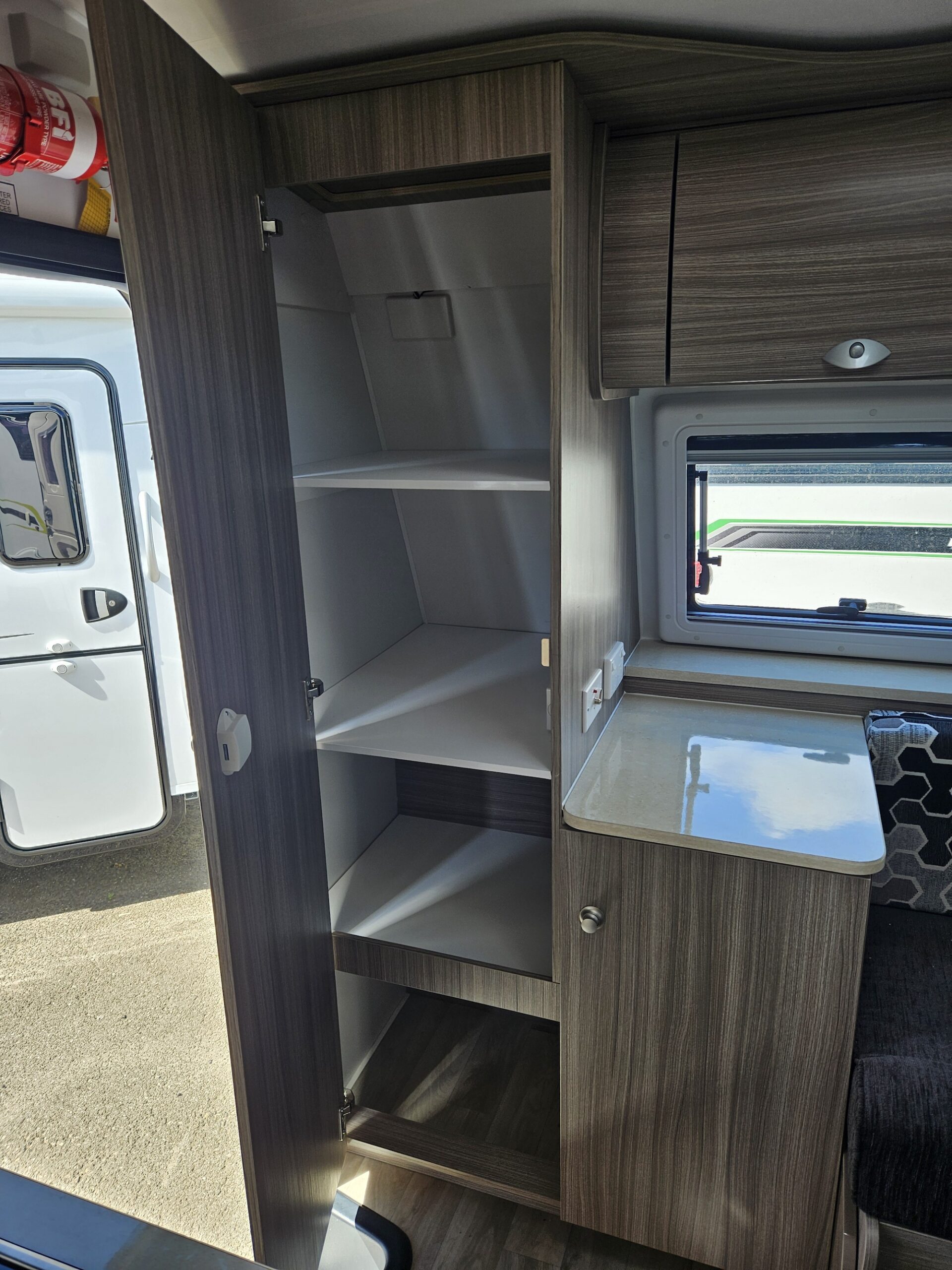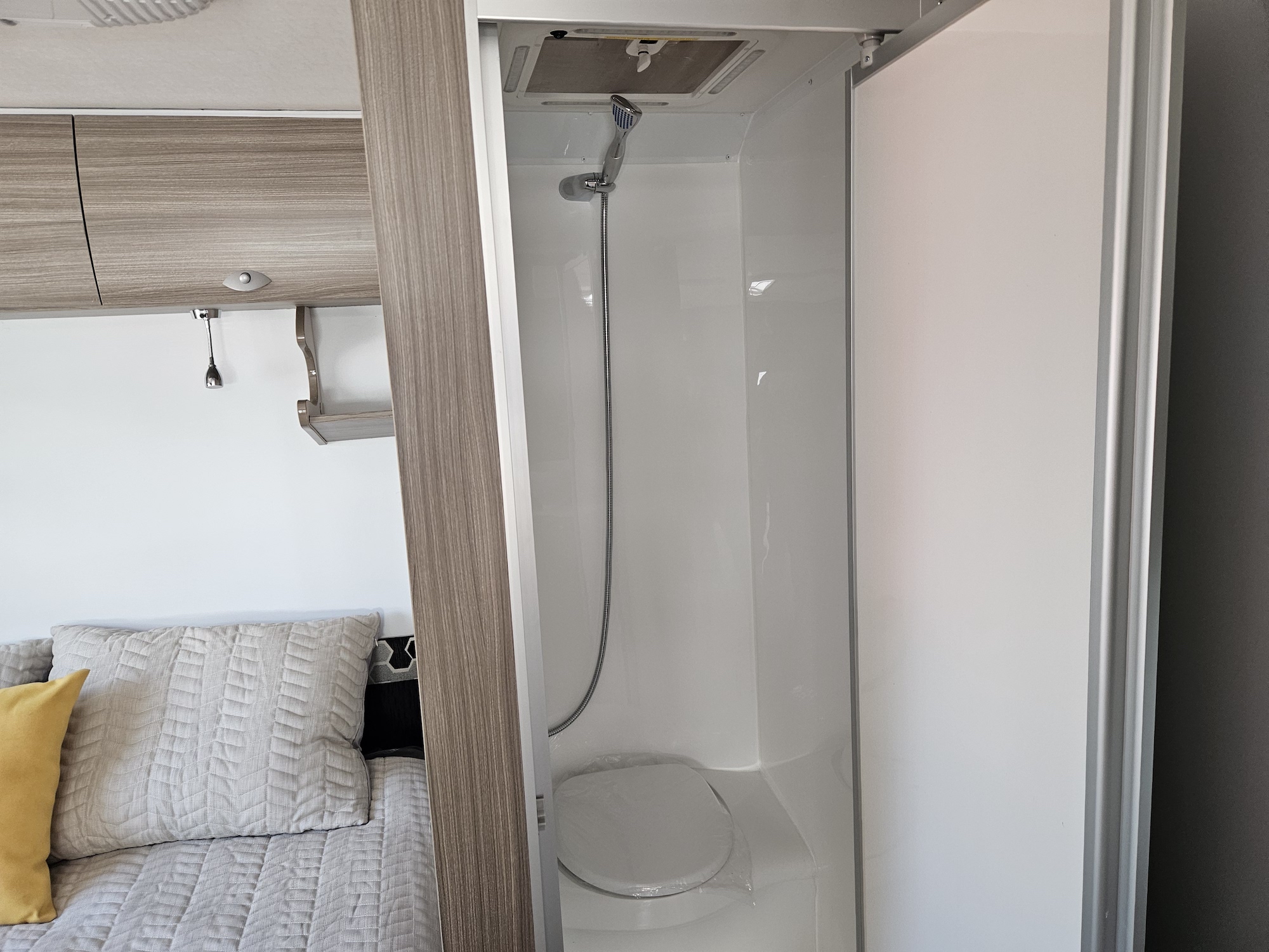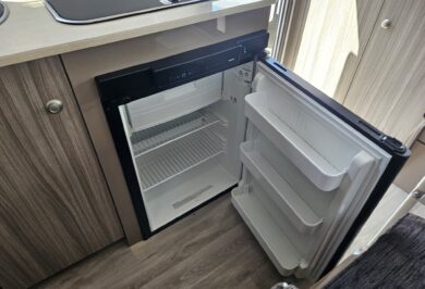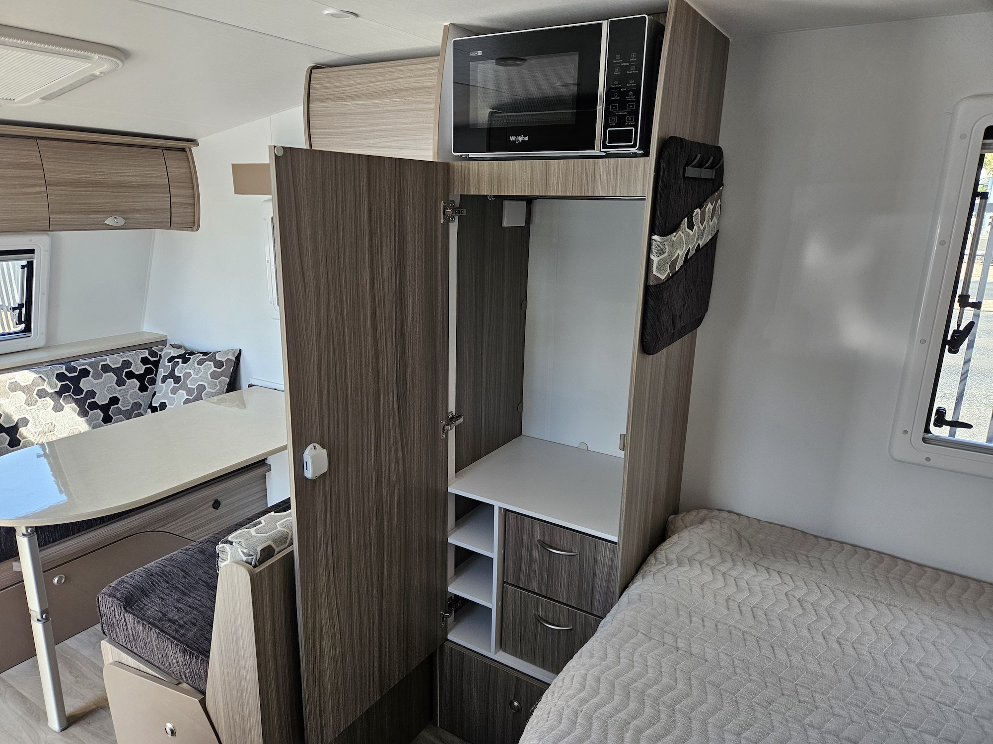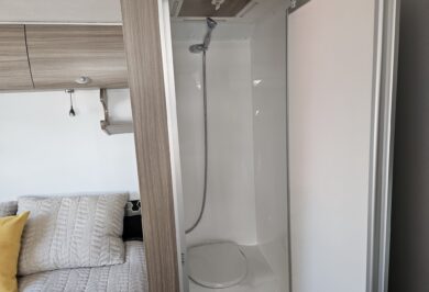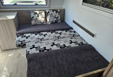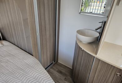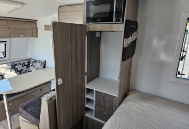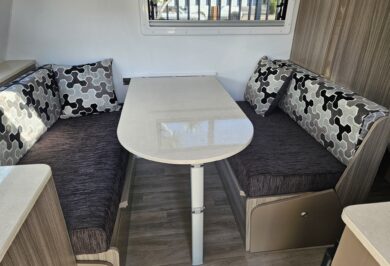At under 17ft, this caravan is remarkably versatile. It comfortably sleeps two people and includes a shower and toilet combo, making it ideal for couples who want independence without upsizing. Inside, the double bed layout and L-shaped dining create a practical, open feel with smart use of space throughout.