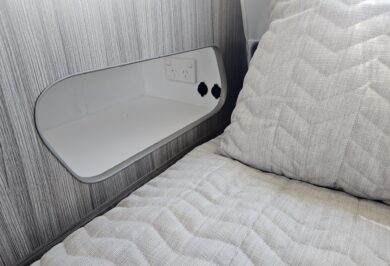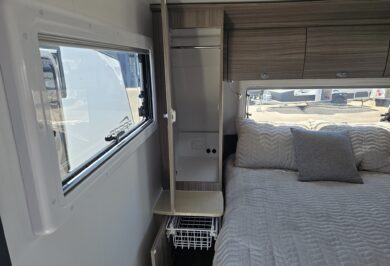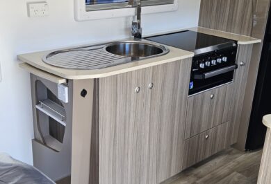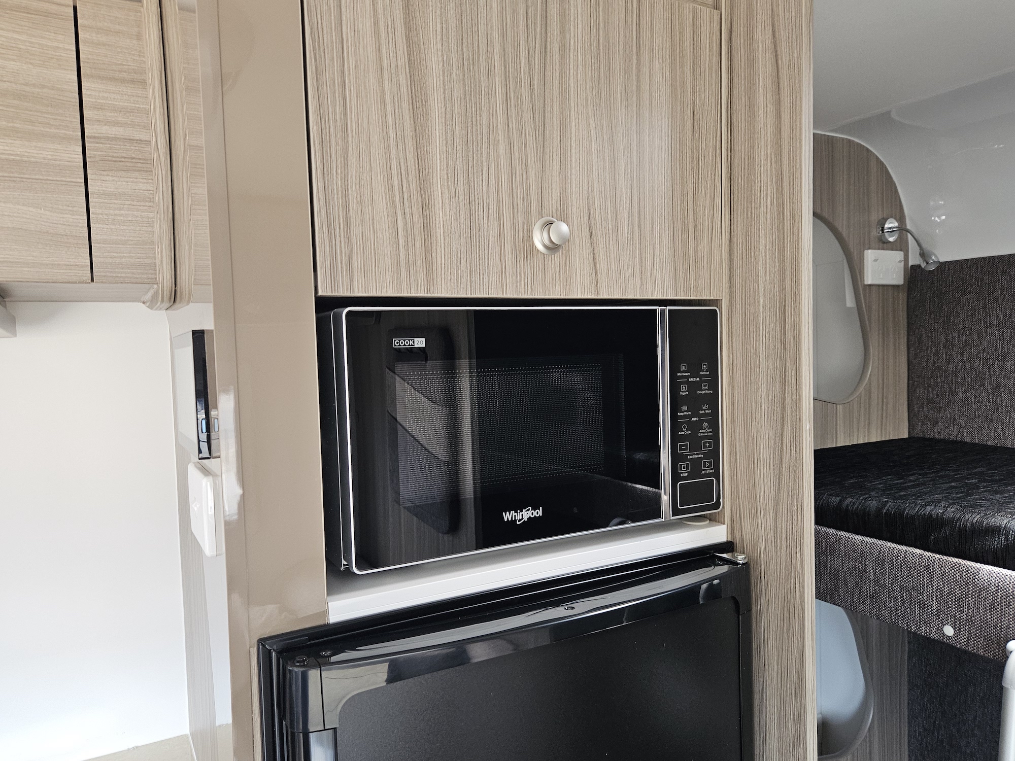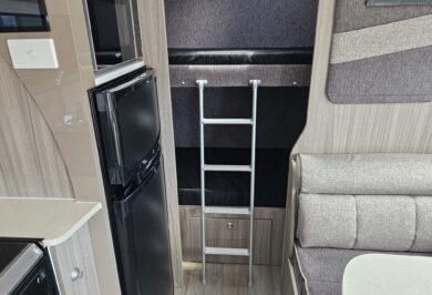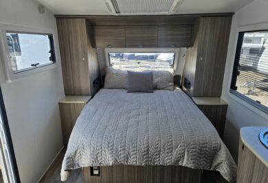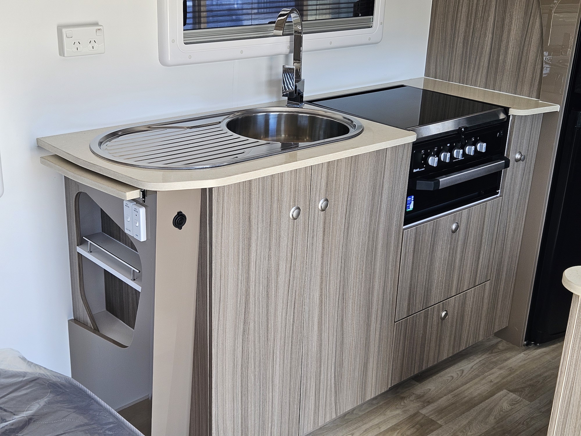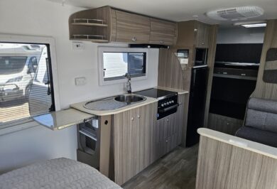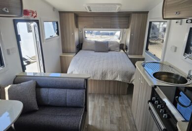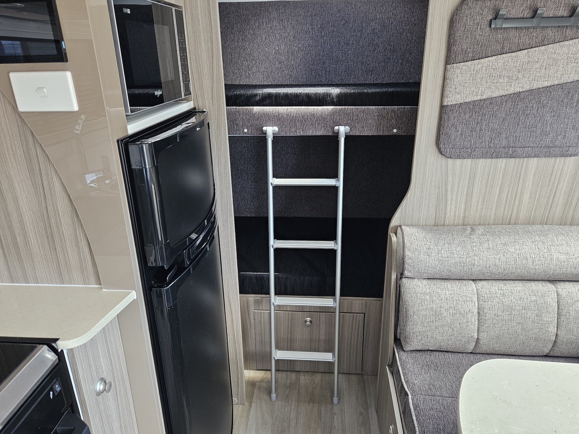 Inside, you’ll find a clever, open living area with comfortable seating, well-equipped kitchen and plenty of storage, while the dedicated bunk beds make it perfect for families travelling with kids. Air conditioning, LED lighting, 3-way fridge, microwave and a full cooktop ensure you have all the comforts of home wherever you pull up.